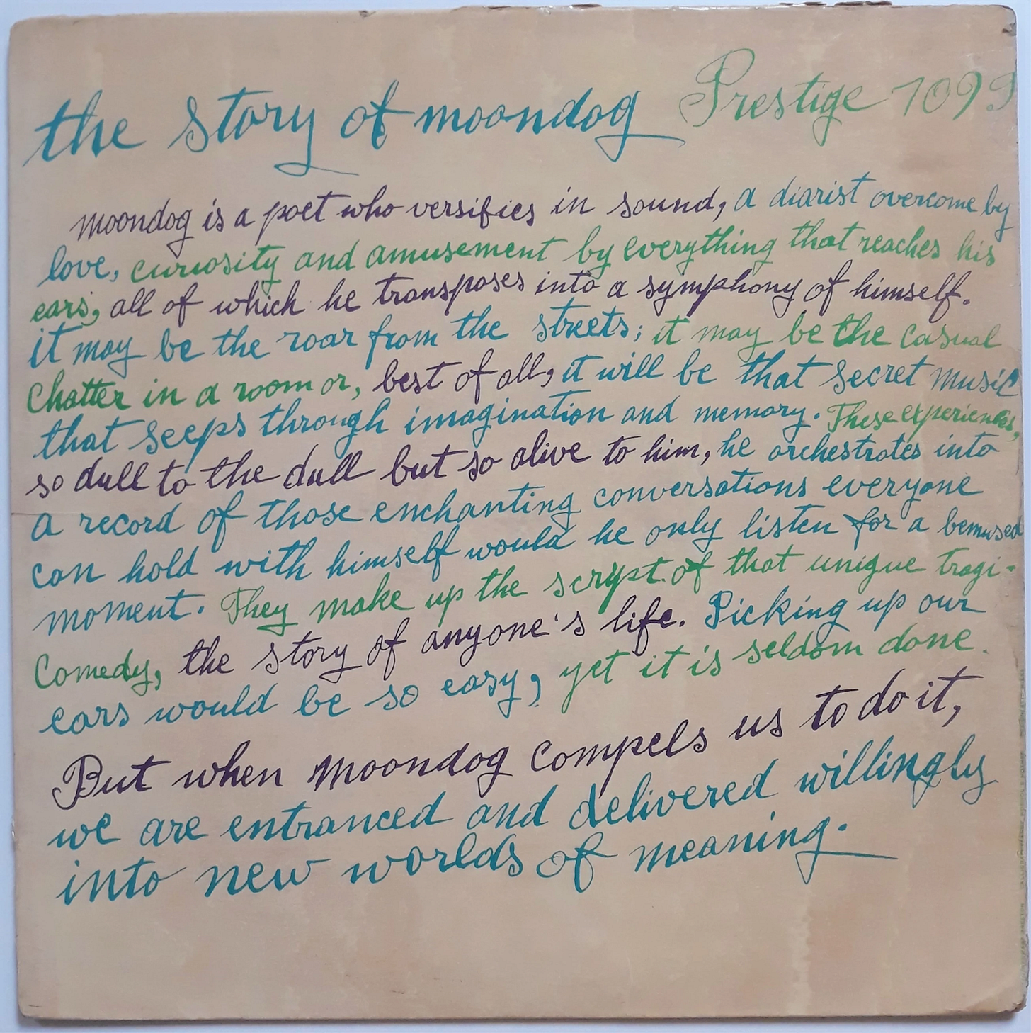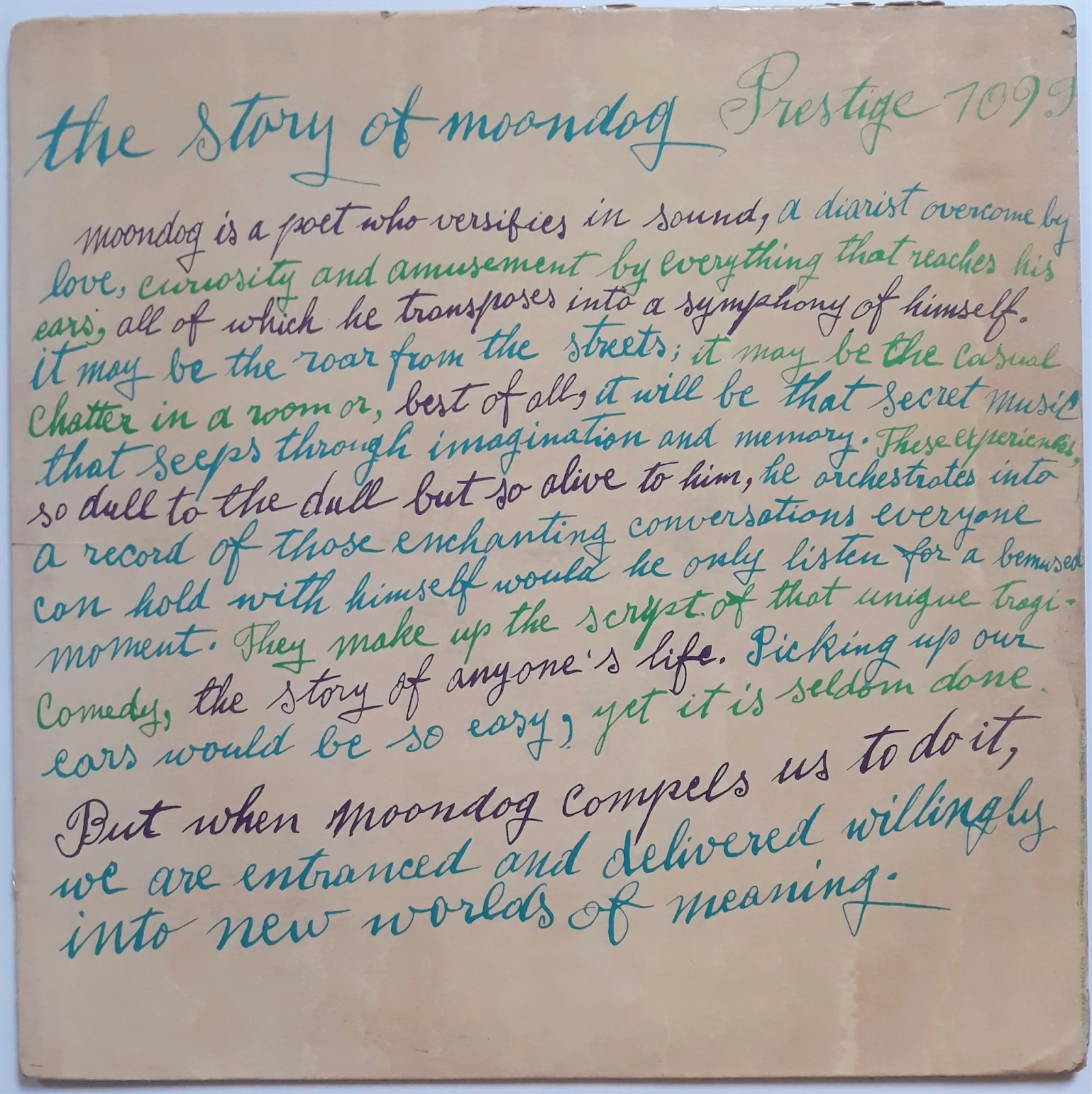 For the cover of The Story of Moondog, a 1957 Prestige album by the blind, avant-garde street musician Moondog (featured in WITI’s Moondog Edition), Andy gave the entire cover over to his mother’s flowing, looping script, with a text literally telling the story of Moondog. Warhol gave the finished black drawing to Reid Miles, who then colored the sentences into alternating vivid greens and blues. The cover won a Certificate of Merit from the Art Director’s Club of New York, crediting “Andy Warhol’s Mother” as the creator.