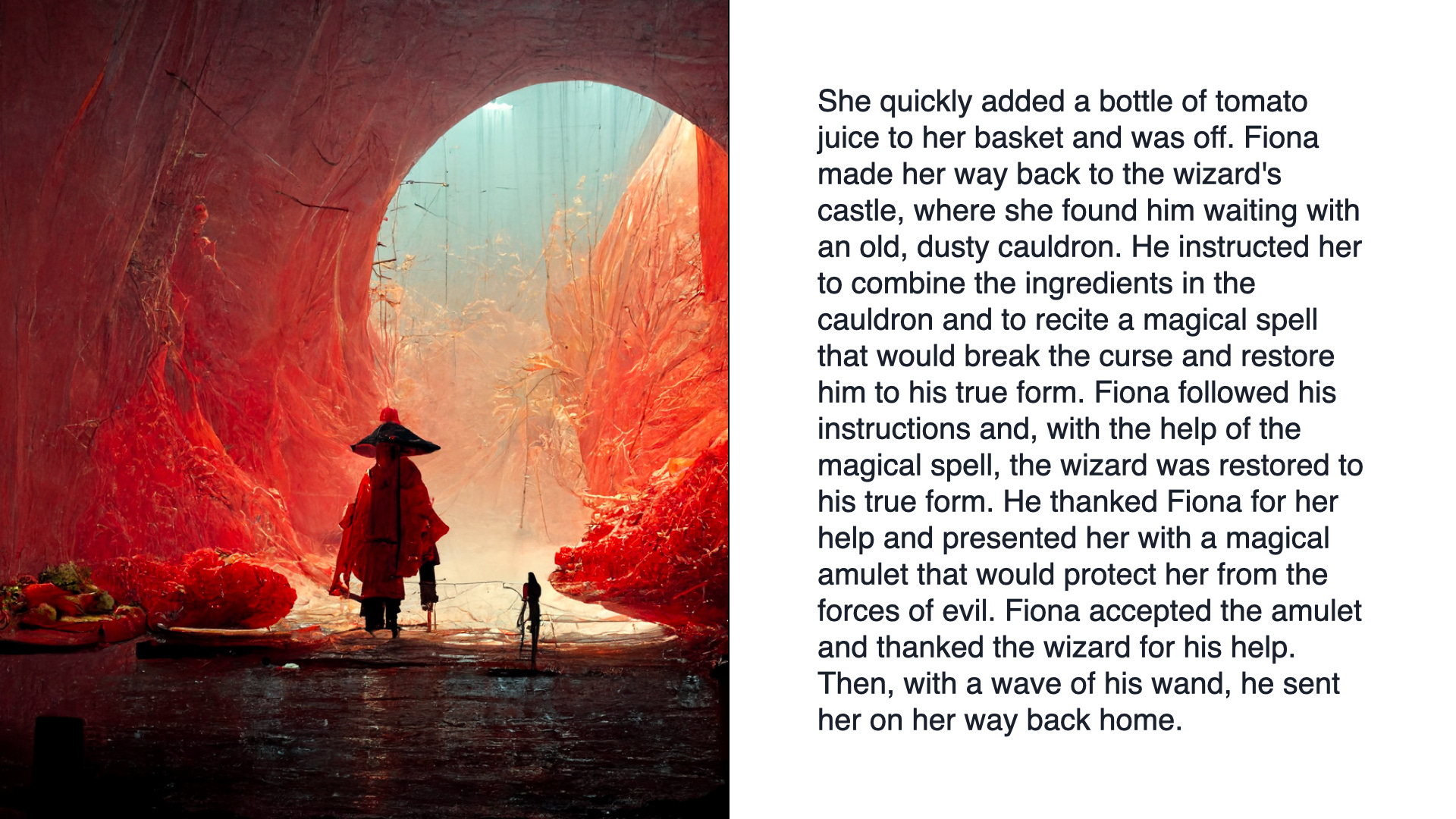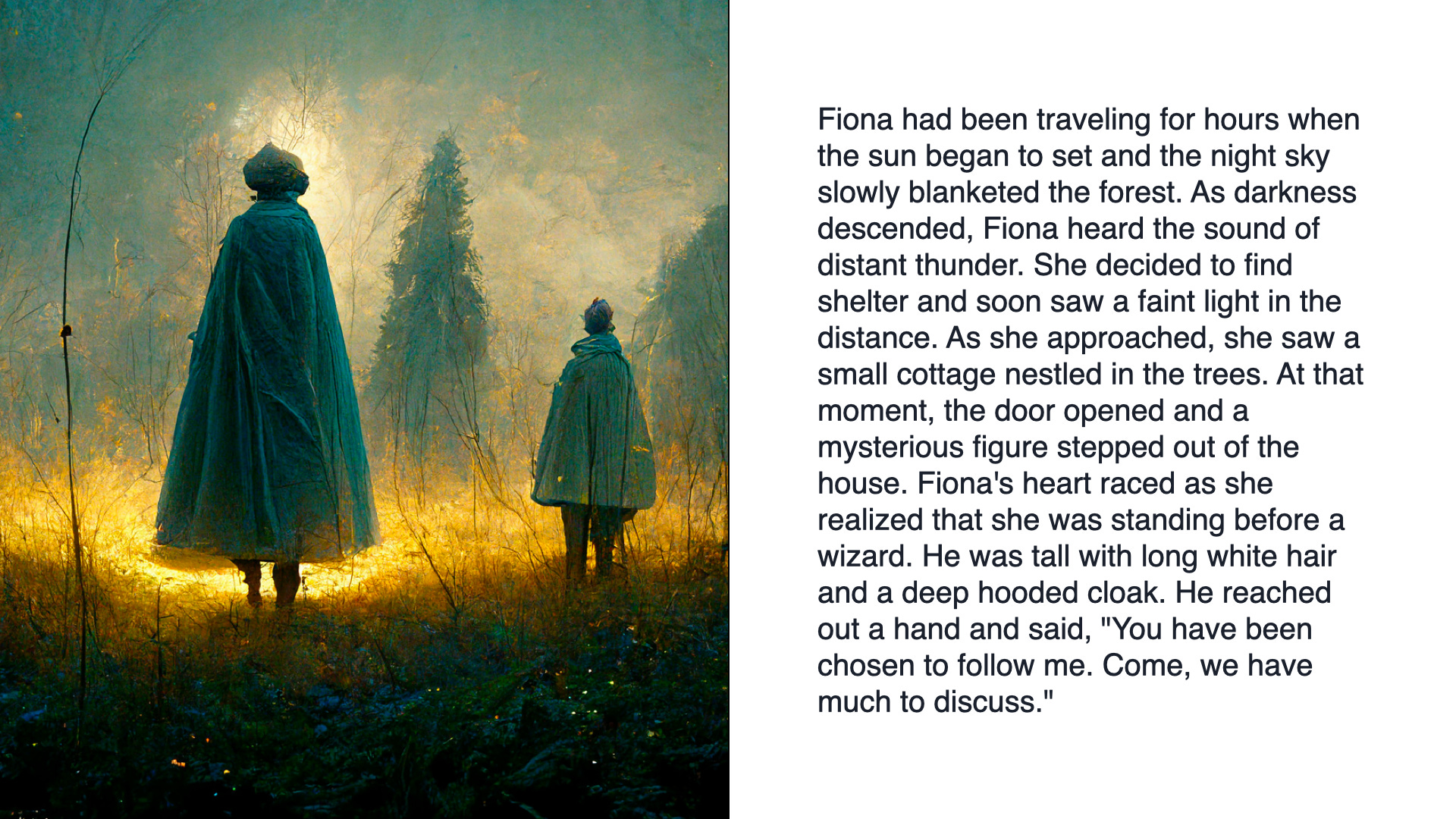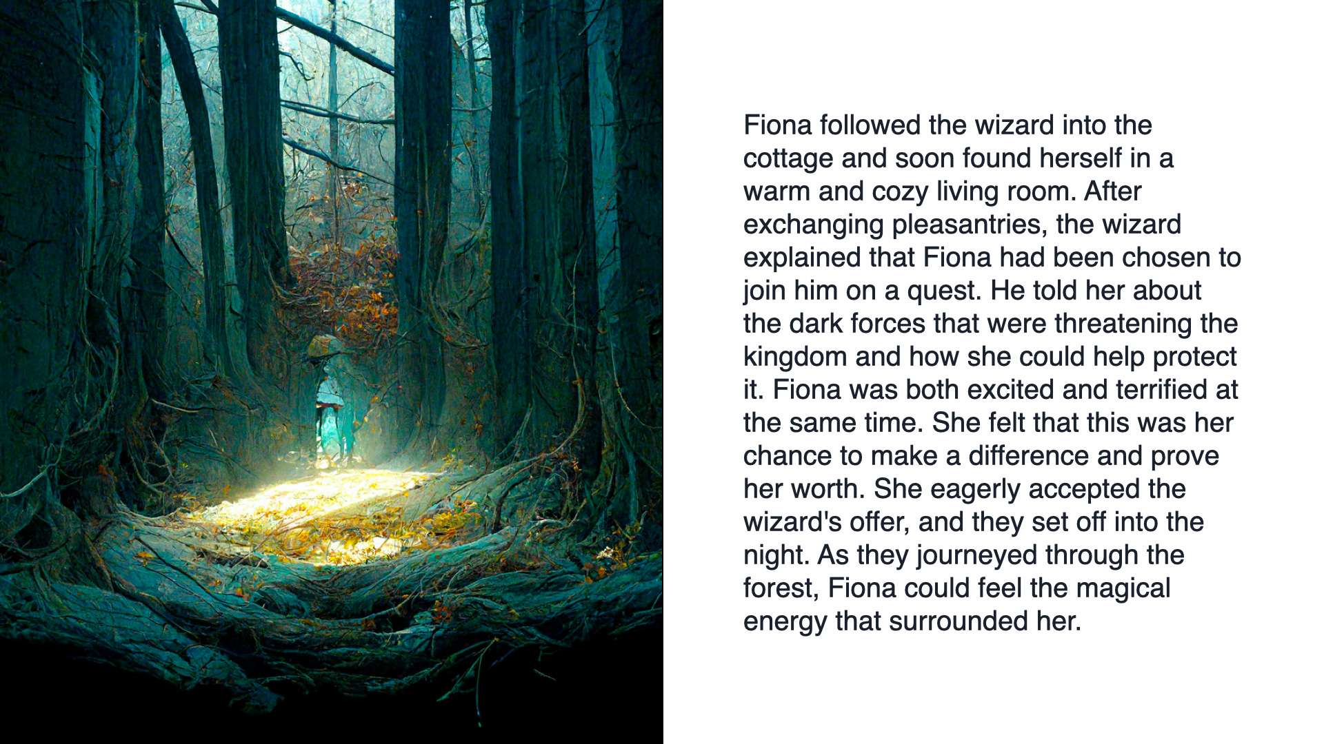 Loved the enchanting story line. Wonder where the dragon came from and why he took the wizard away...back to his own cottage. If this was written by AI with just the words and suggestions from your daughter - this is amazing. Someone's memories or familiar references or scenarios must have been programmed into it for it to follow the path of friendly meeting-danger-request for help-rescue offer-successful rescue-reward pattern. Wondering...did Fiona and the wizard maintain their friendship and stay in contact?