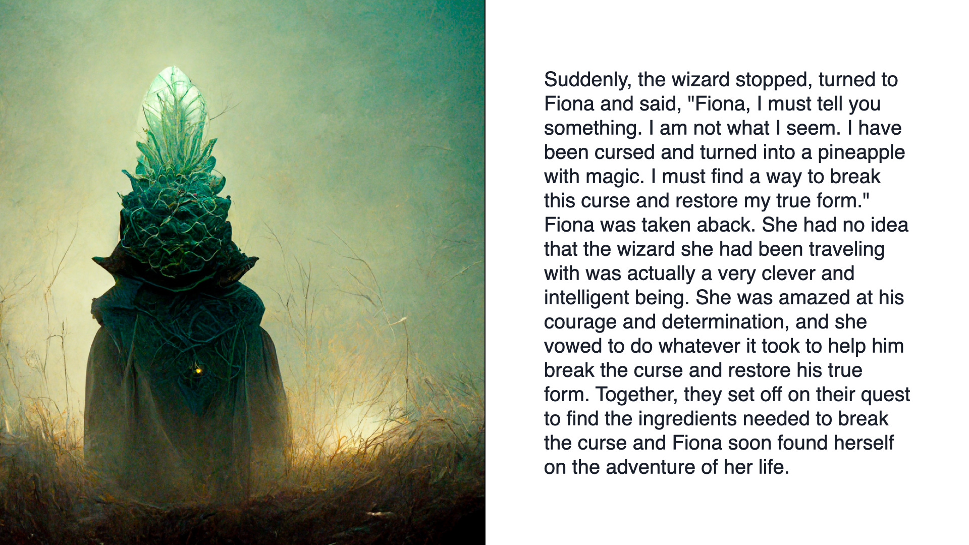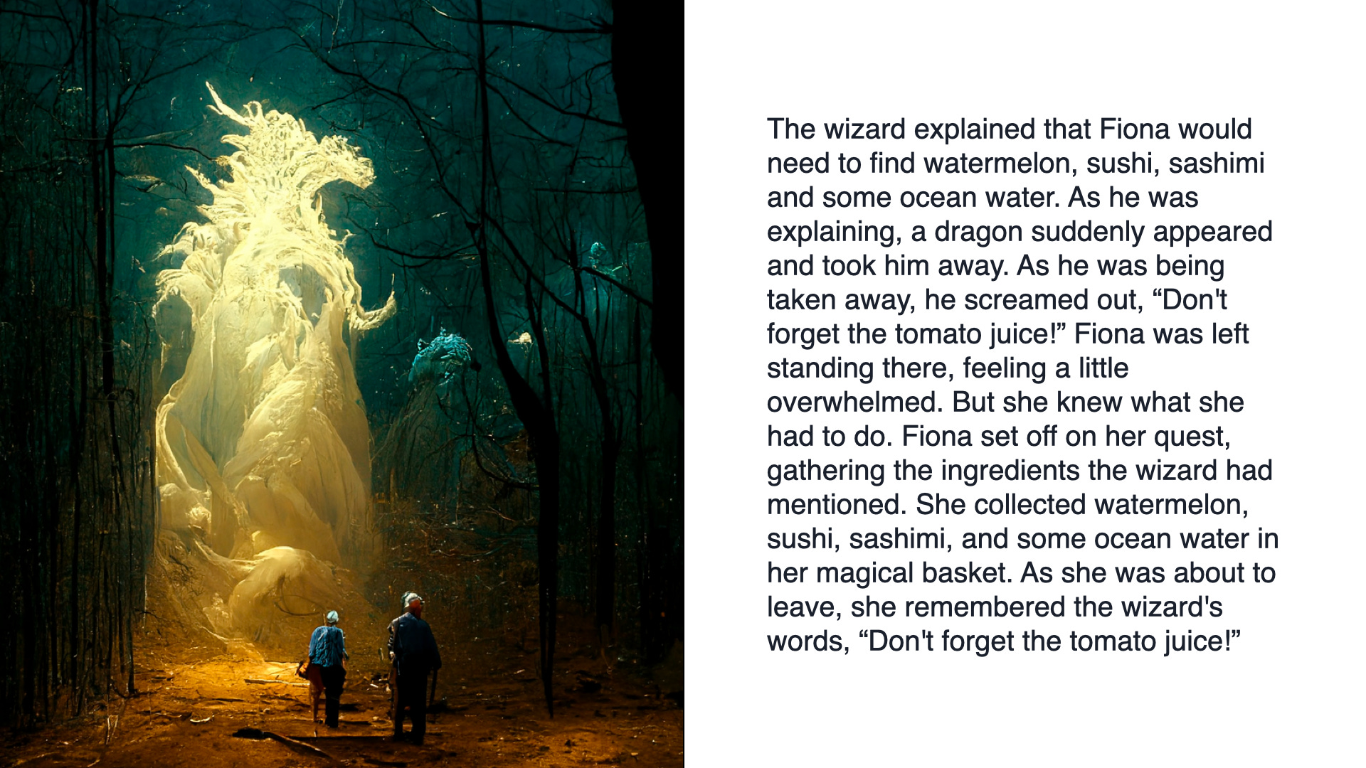 Continue this story when Fiona and the pineapple wizard are walking, and the wizard is explaining what Fiona needs to break the curse, like watermelon, sushi, sashimi, and some ocean water. But as he's explaining, a dragon comes and takes him away. As he's being taken away he screams, "don't forget the tomato juice!"