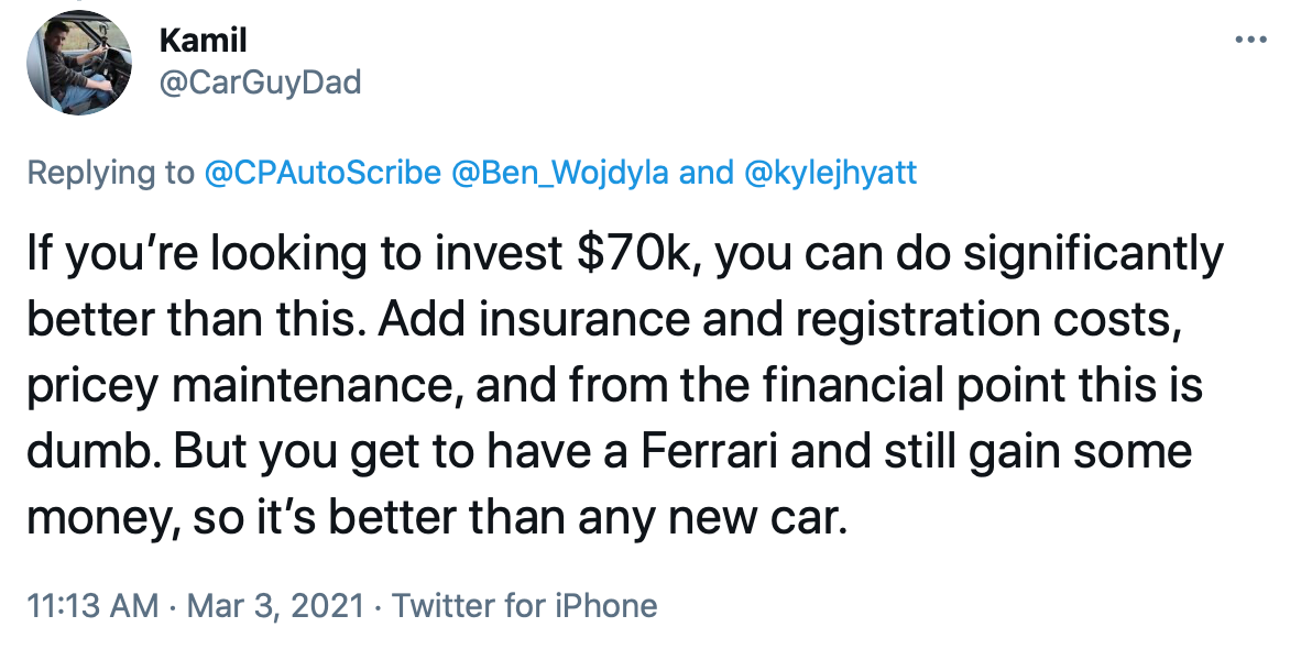 The other bit of cultural zeitgeist at play here has to do with Covid-19. The pandemic has created a bizarre, likely temporary, effect on the automotive market where demand was outstripping supply and the used car market was booming. (For reference, my previously mentioned Fiesta ST sold for almost what I paid for it new a year prior—unheard of in the highly depreciative new vehicle market.) Sites like Carvana (which plays to a more utilitarian used car buyer) have thrived. While not the easiest or the most profitable asset, cars are no longer the investment black hole they were long considered. Or, put another way: