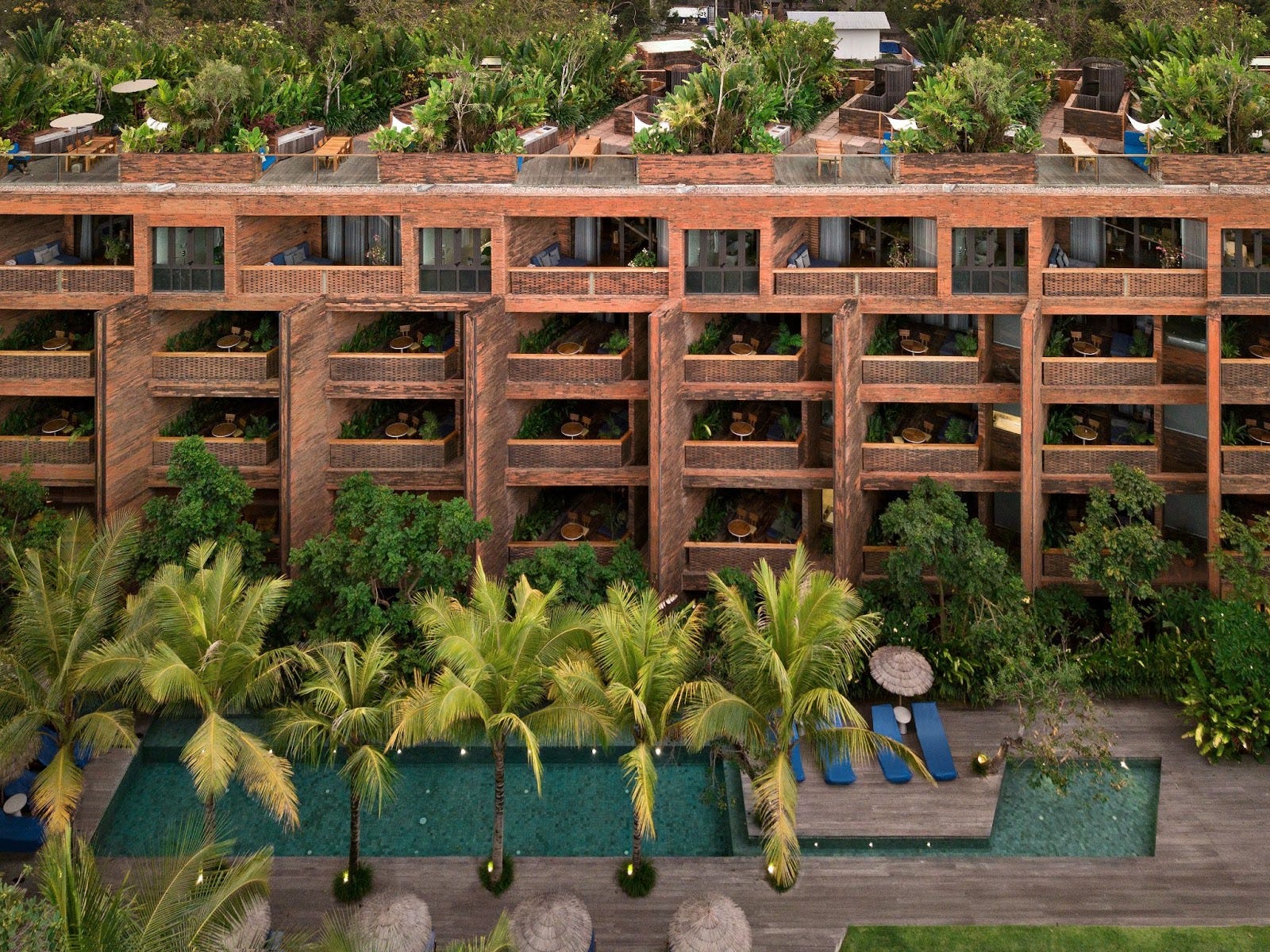 Katamama, designed by Indonesian architect Andra Matin, who developed his skills working for the legendary Hendra Hadiprana, features architecture that harmonises building and guest, blending Balinese artistry with contemporary design through meticulous hand craftsmanship. Each of its 1.8 million bricks is individually shaped and fired by hand in a single village in Tabanan, utilising traditional techniques. This time-honoured process employs coconut shells to fuel the kilns. This remarkable, two-year undertaking resulted in Katamama's impressive foundation, a seamless integration of monolithic structure and intricate, light-enhancing patterns. In 2021, Katamama was rebranded as Potato Head Suites.