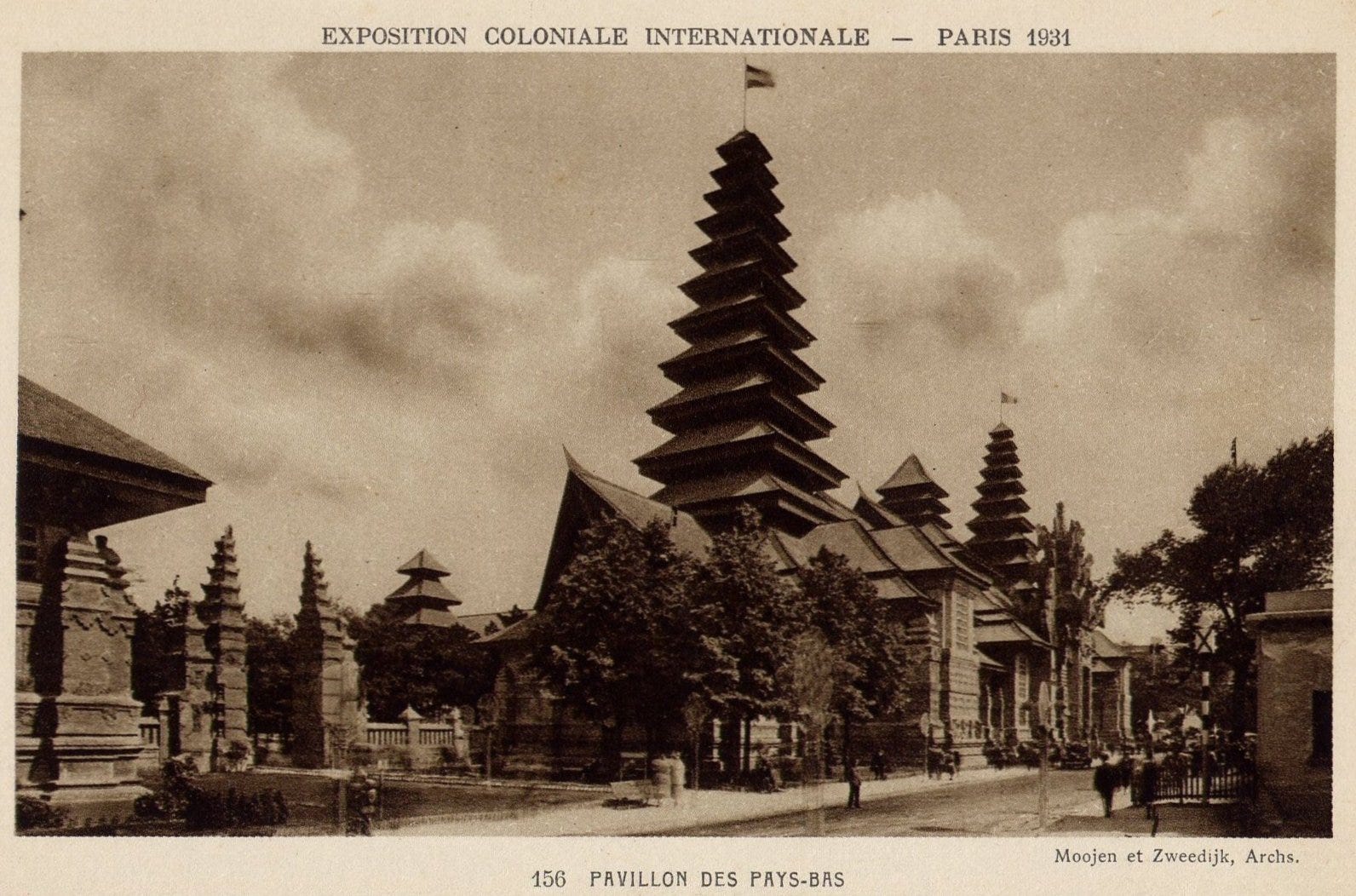 The Dutch Pavilion at Paris’ 1931 Exposition Coloniale Internationale drew inspiration from various buildings and monuments across the Indonesian archipelago, especially Bali. Architects P.A.J. Moojen and W.J.G. Zweedijk designed the pavilion in sections, aiming to represent both the grandeur and the artistic heritage of the Dutch East Indies (present-day Indonesia). The main pavilion, with its imposing facade, covered a vast area of over 6,000 square metres.