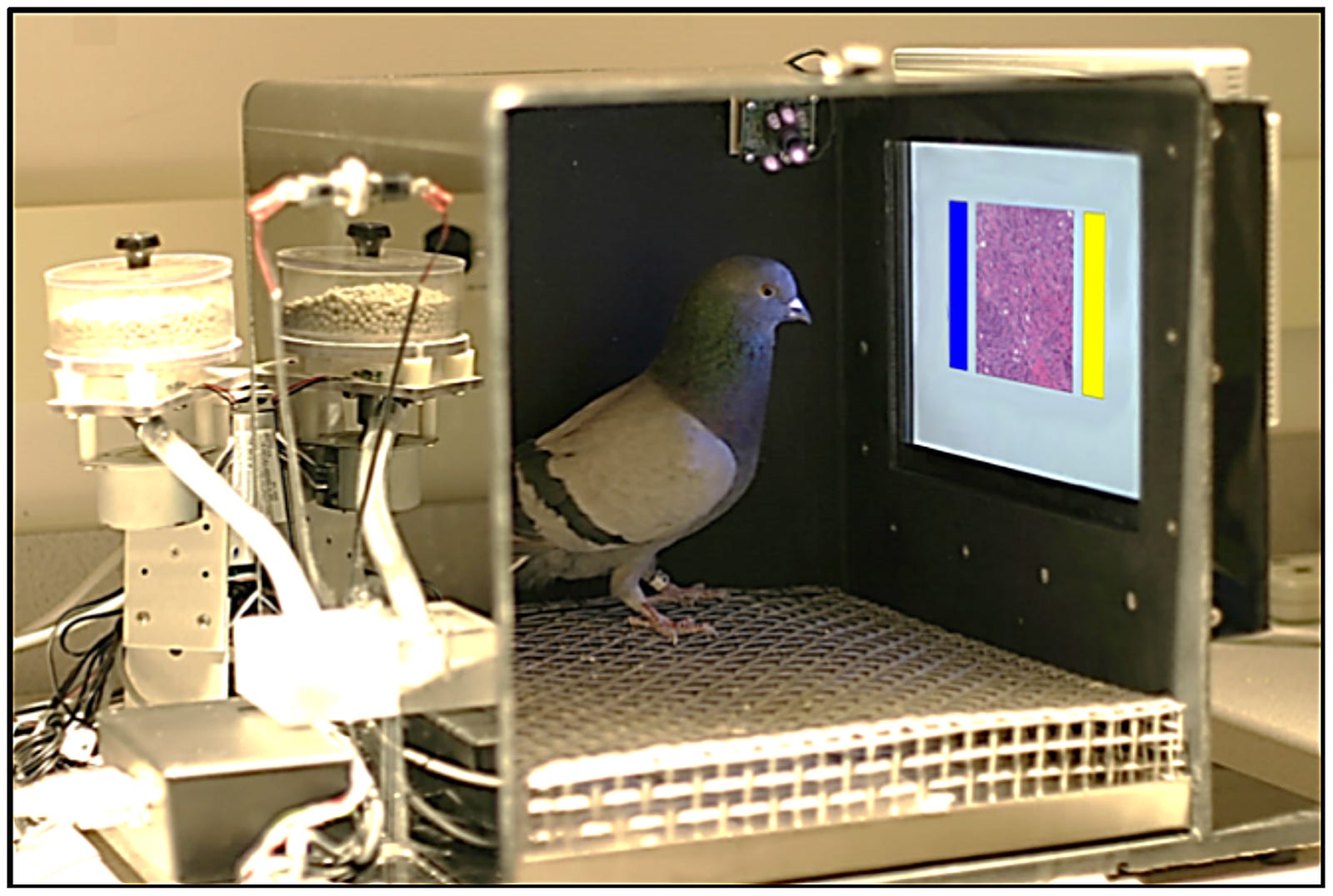 This is far from the first time we’ve tried to use pigeons for their visual abilities. This radiology experiment led me back to this story from World War II where the behavioral psychologist B.F. Skinner got the military to pay for him to try to train pigeons to steer missiles. “Skinner divided this nose cone into three compartments, and proposed strapping a pigeon in each one. As a bomb headed towards earth, each pigeon would see the target on its screen. By pecking at the image, the birds would activate a guidance system that would keep the bomb on the right path until impact. Skinner's idea received initial support, but the U.S. military finally dismissed it as impractical.”