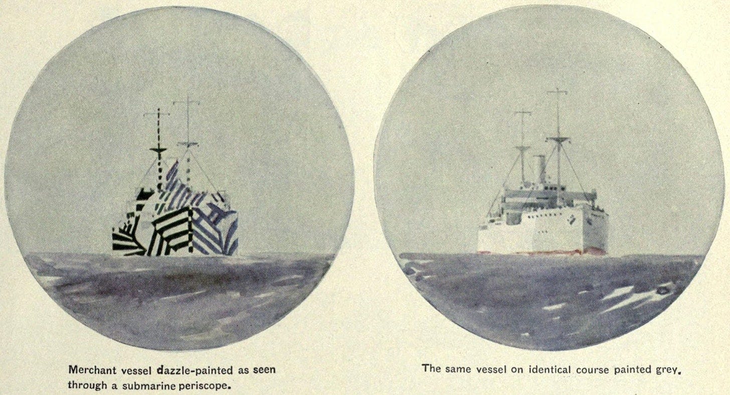 Great write-up. Any discussion of dazzle camo always brings to mind this stunning Wadsworth print: https://en.wikipedia.org/wiki/Dazzle-ships_in_Drydock_at_Liverpool