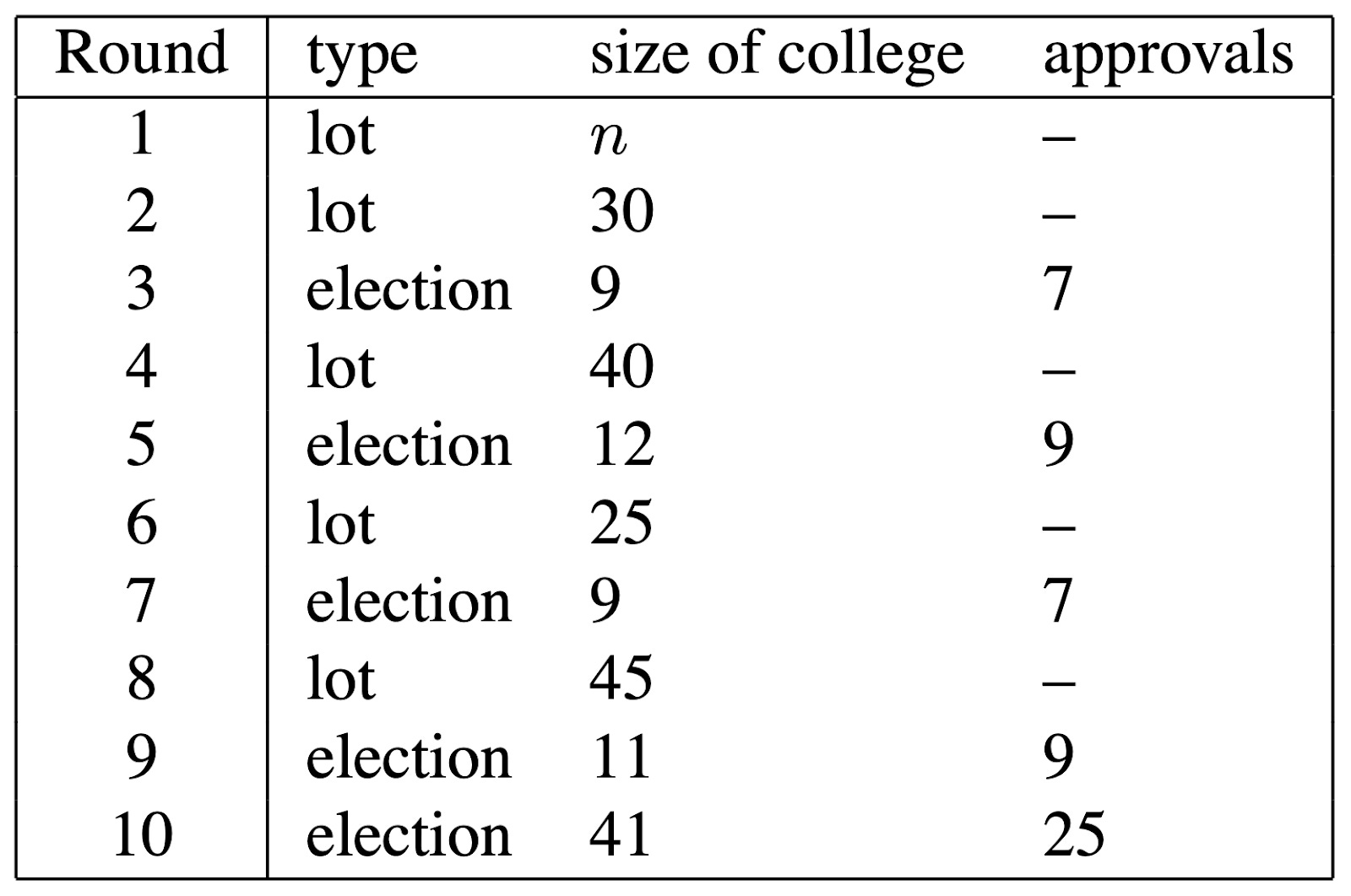 Thirty members of the Great Council, chosen by lot, were reduced by lot to nine; the nine chose forty and the forty were reduced by lot to twelve, who chose twenty-five. The twenty-five were reduced by lot to nine, and the nine elected forty-five. These forty-five were once more reduced by lot to eleven, and the eleven finally chose the forty-one who elected the doge. Election required at least twenty-five votes out of forty-one, nine votes out of eleven or twelve, or seven votes out of nine electors.