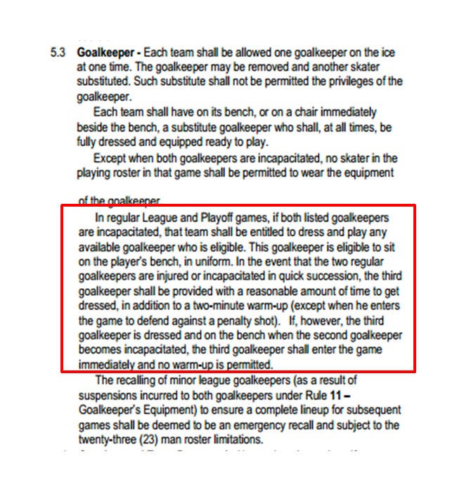 Surjan here. Last week, Tom Hodges attended a hockey game in Dallas after a long day selling life insurance. Halfway through a hotdog, he got a call, walked out to his car to grab his gear, and, not long after, made his debut as a goalie in the National Hockey League. Tom is an EBUG, or emergency backup goalie—a product of one of the most unique rules in all of professional sports.