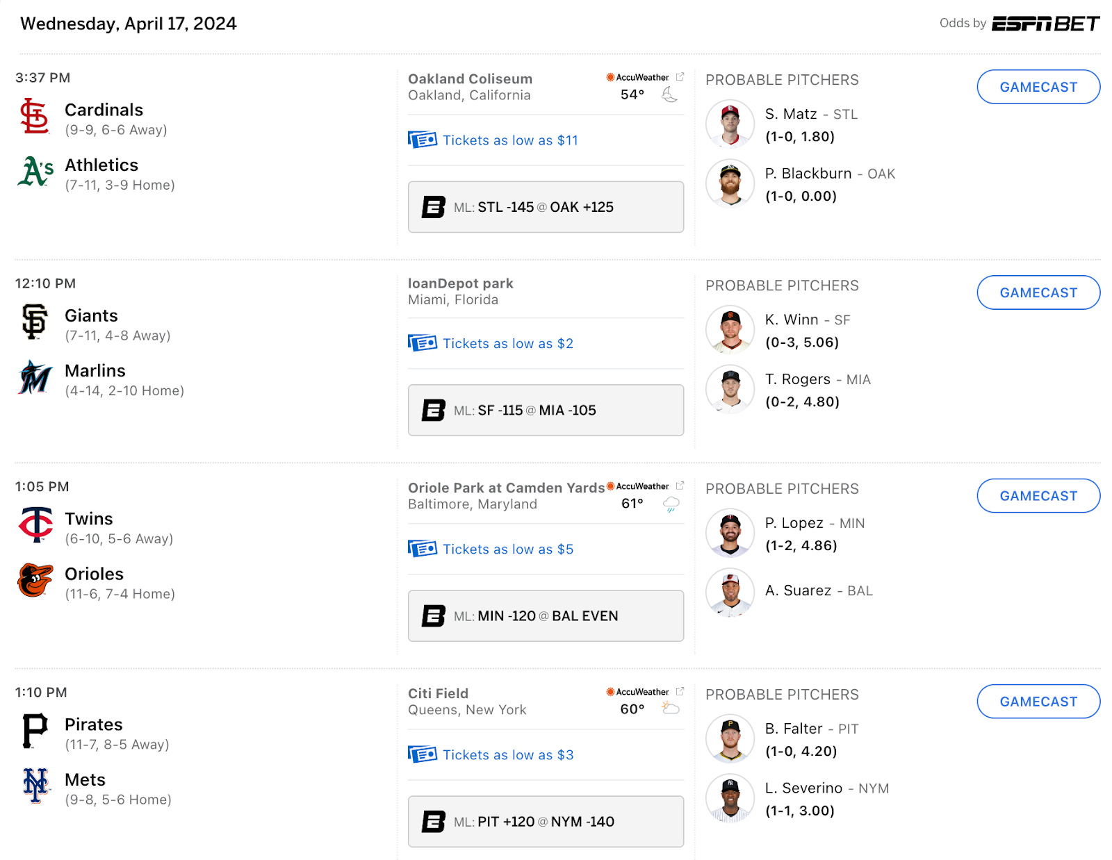 Let’s look specifically at the first game, the St Louis Cardinals (STL) against the Oakland Athletics (OAK). Here, ESPNBet (and yes, that’s a thing) has the money line odds (referred to here as “ML”) at -145 for STL and +125 for OAK.