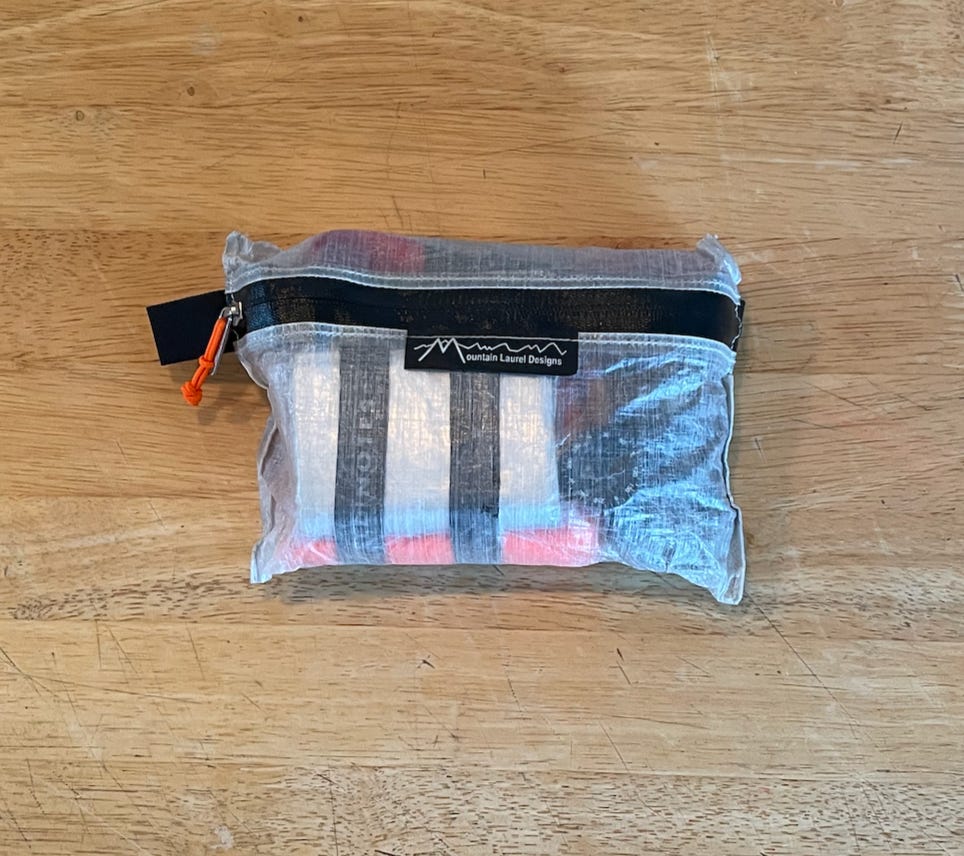 I use a Medium Dyneema Composite Fabric Zip Pouch, $13.00 from Mountain Laurel Designs.