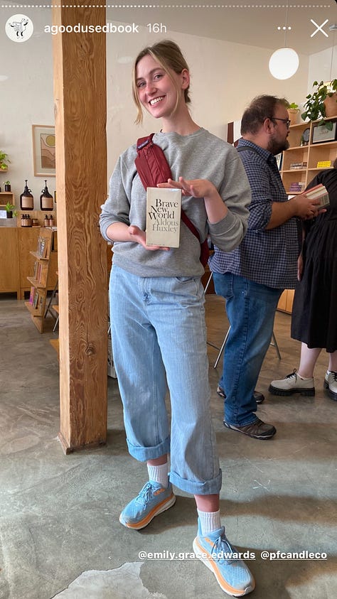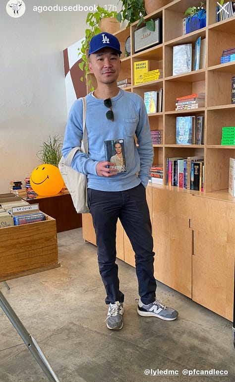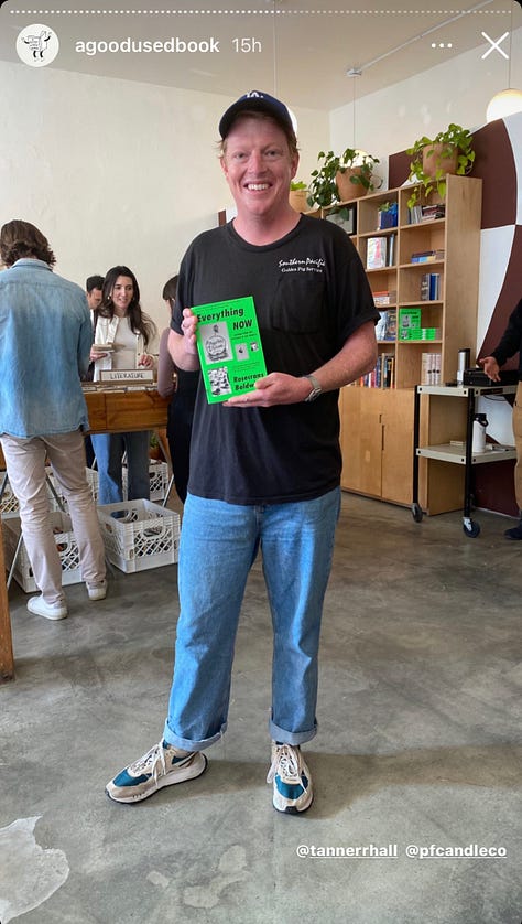What is striking is how the feed feels like a place to earn a little status, with Millennial and Gen Z LA living its best bro, queer, uptight, loose, nerdy, Bode selves—all framed around well-worn editions of Chekov, Freud, and maybe a copy of Rosecrans Baldwin's truly imaginative and quirky Everything Now that seems to have shown up a lot this weekend.