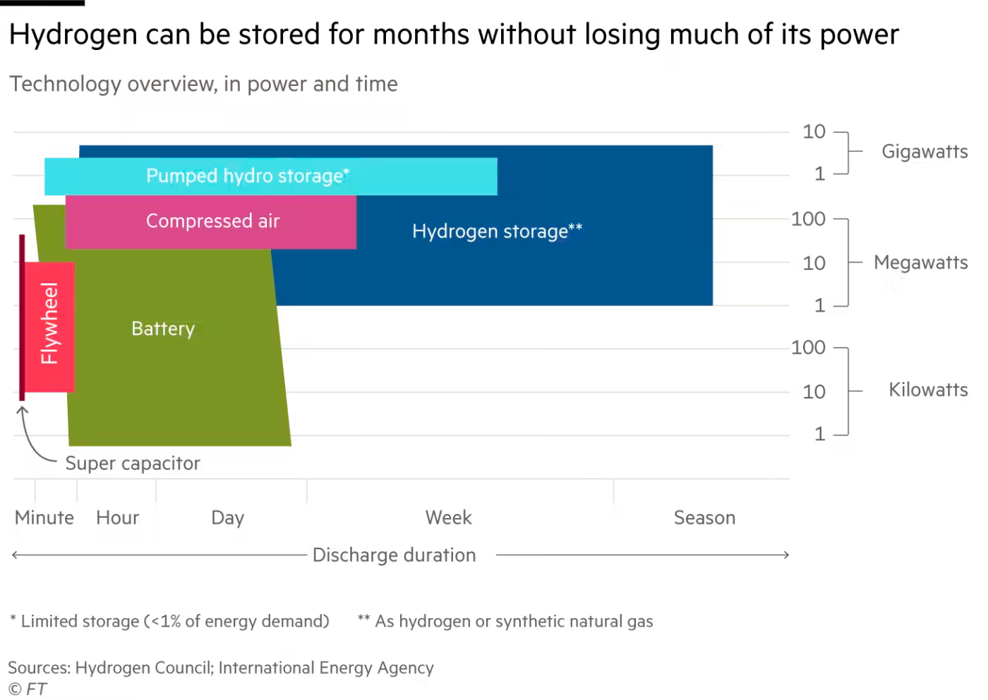 For one, hydrogen storage can hold months’ worth of energy. While other batteries can sustain individual houses or even towns for 24-48 hours of crisis, with hydrogen you can build a huge reserve during the windy season, or the sunny season, and rely on it for months.