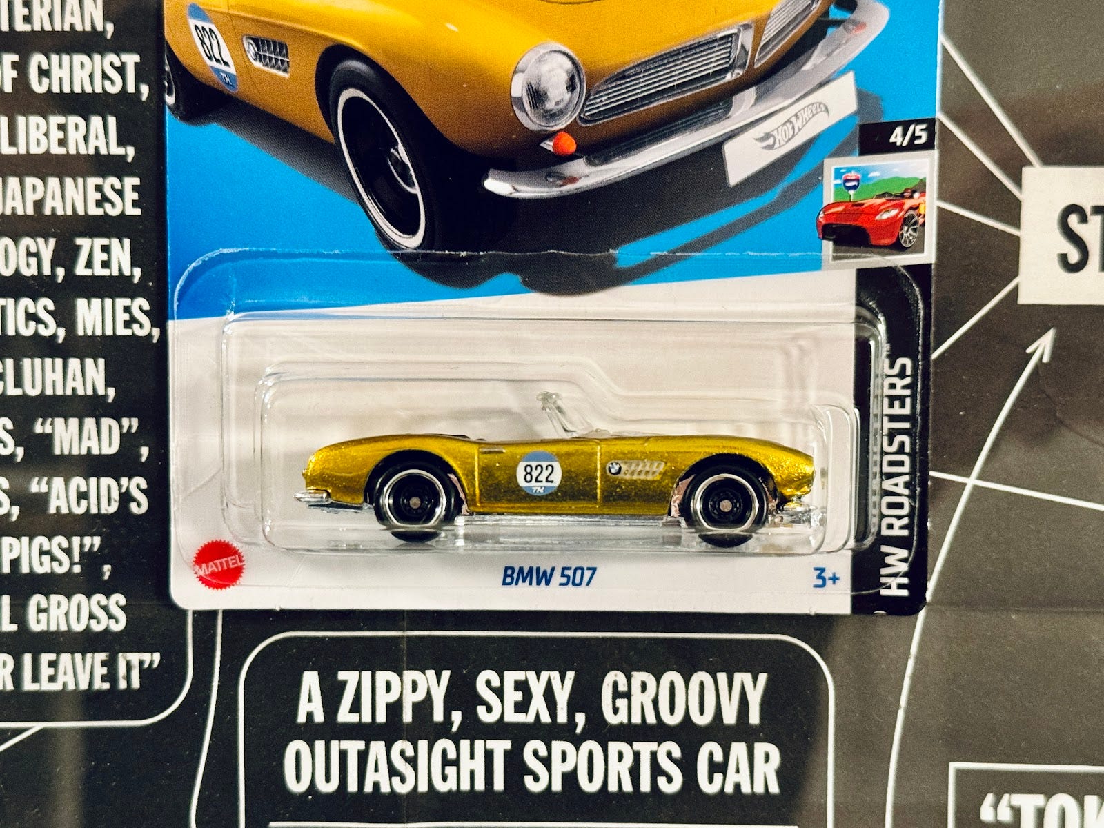 Ryan here. A few weeks ago, on an otherwise unremarkable trip to my local grocery store, a miracle awaited. Hanging from a peg in aisle 4 (juice, sodas) next to the Polar Dry was a 1:64 scale, die-cast BMW 507 in metallic gold Spectraflame™ finish, sitting on rubber RealRider™ tires. To the average shopper, this would appear as just another toy car sprinkled throughout the store to entice bored children. But to a very particular type of collector, it was like finding the Chachapoyan Fertility Idol sitting next to a “Wine a Little, Laugh a Lot” sign on a shelf at HomeGoods.