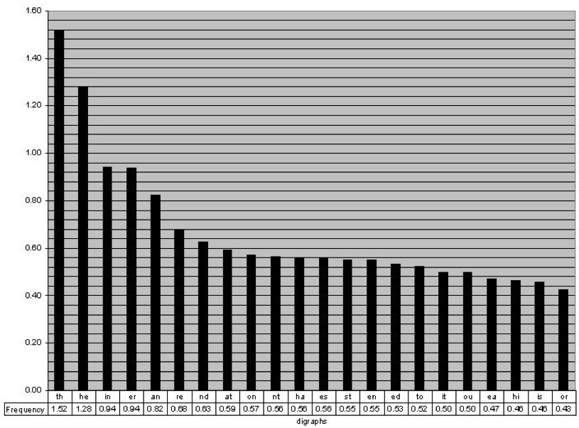 What’s wrong with that last example is that letters don’t operate independently. Let’s play a game for a second. I’m going to say a letter and you guess the next one. If I say “T” the odds are most of you are going to say “H”. That makes lots of sense since “the” is the most popular word in the English language. So instead of just picking letters at random based on probability what Shannon did next is pick one letter and then match it with its probabilistic pair. These are called bigrams and just like we had letter frequencies, we can chart these out.