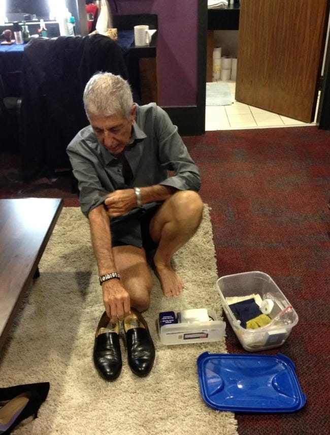 Because the image search result for “Leonard Cohen dress shoes” wasn’t, as I expected, pictures of the man onstage in full garb. Instead, it was a ton of pictures of him sitting on the floor of hotel rooms, shining his shoes himself. (Mostly via the now-defunct Cohen treasure trove, AllanShowalter.com). Here’s one: