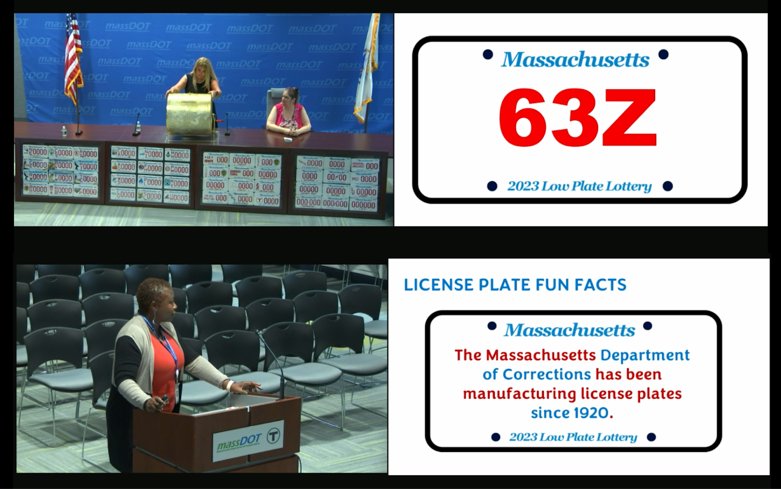Between every 5 or 6 draws, however, the ceremony is punctuated by a third woman who stands at a separate lectern and shares license plate fun facts, like the history of special plates in Massachusetts, or a brief thanks to the Department of Corrections for manufacturing all of Massachusetts plates. She also commands applause for the winners of the lottery.