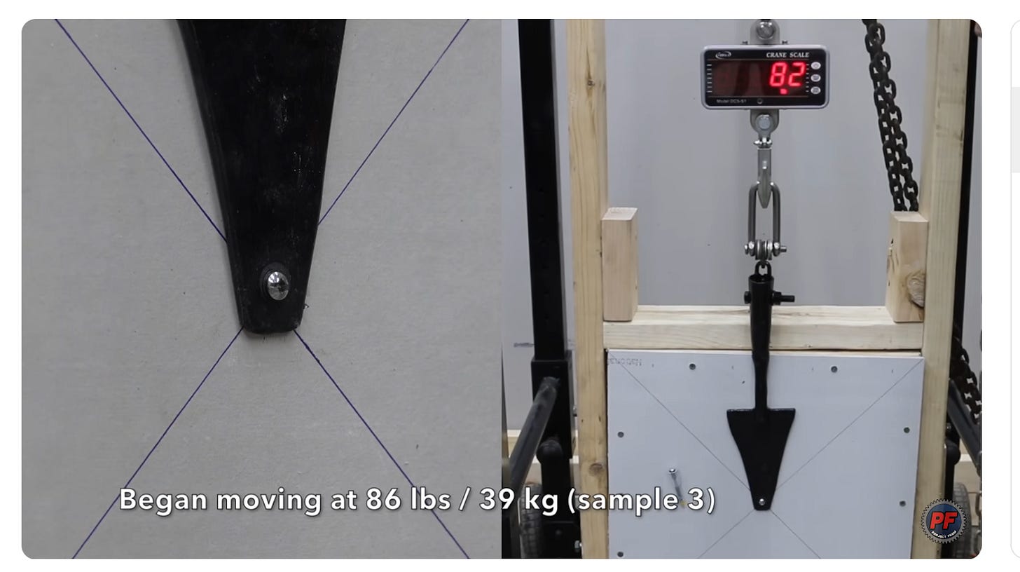 Part of the fun of the channel is watching the crazy ways he comes up with to test these tools. The Project Farm Drywall Anchor review included tests measuring every possible way one of these things could be pulled out of a wall.