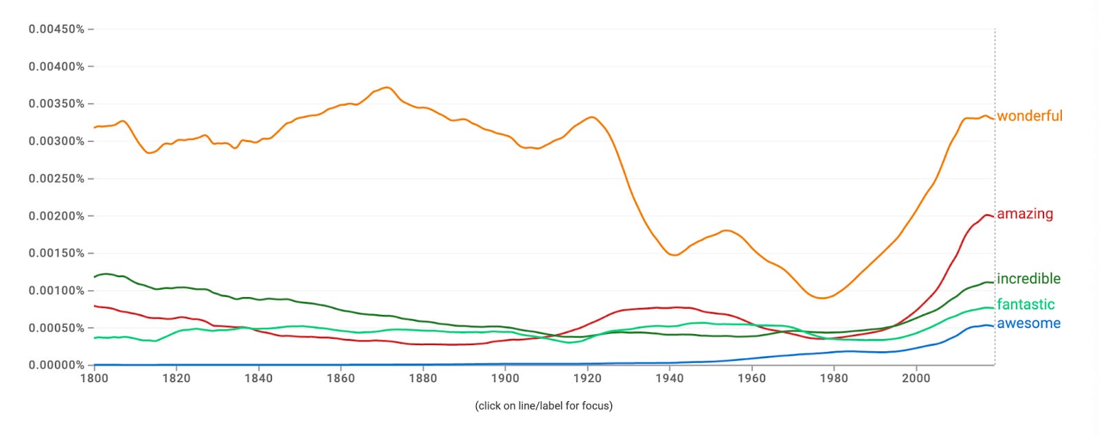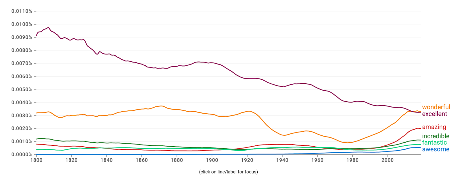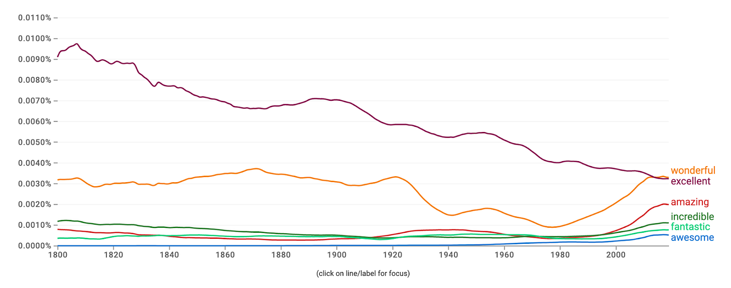 But there’s something else that caught my eye here when digging into the Ngrams charts. Specifically, when I included excellent, I saw a very different picture. It totally reoriented the chart and showed a long decline, despite being in the Lithub article’s opening anecdote (“I’d like to make an appointment for my dog, I said. Wonderful, said the scheduler. June McCrary. Excellent. She needs an anal gland expression. Fantastic!”)