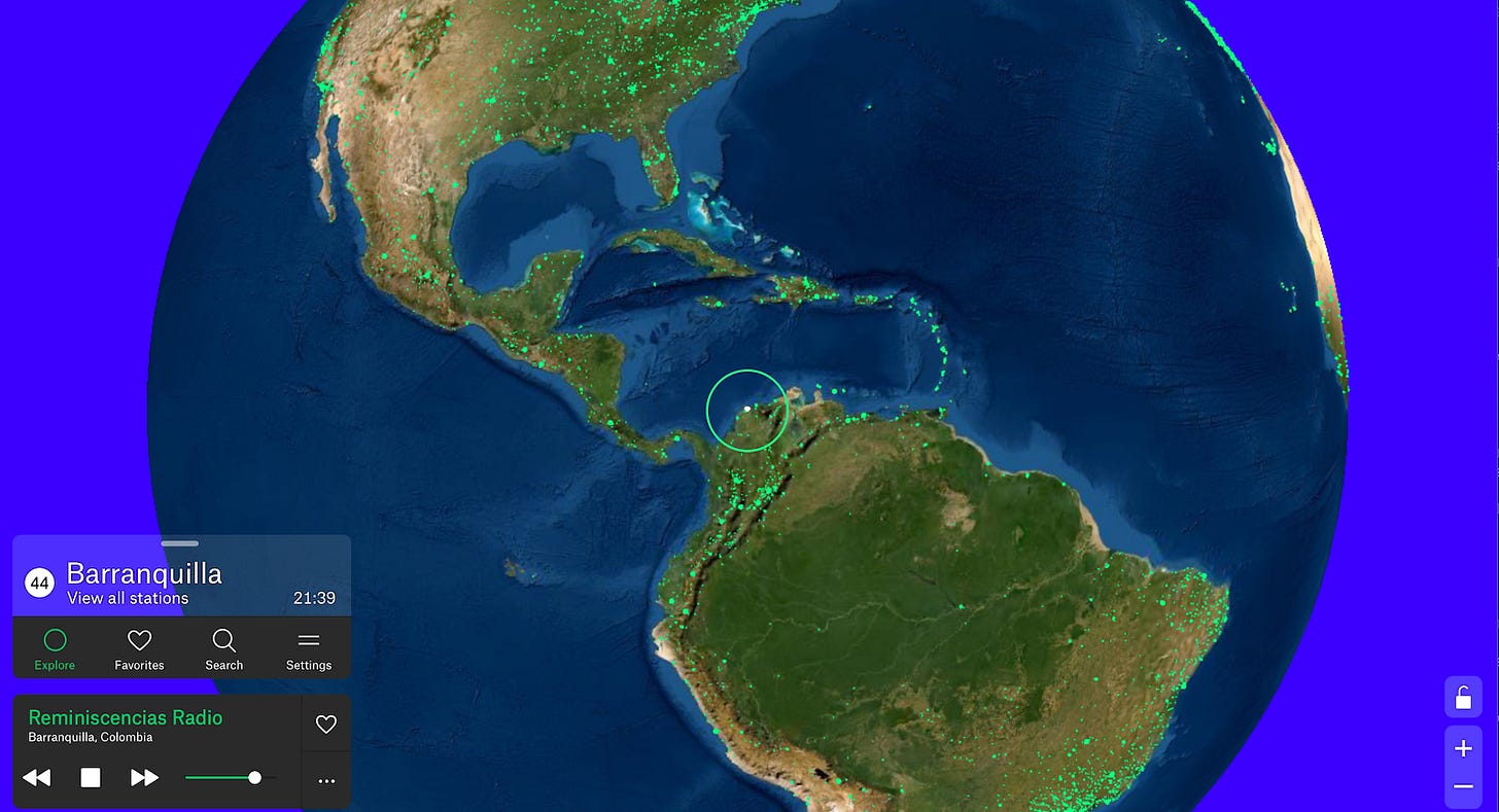 Every green dot you see is a radio station that you can stream right within the browser. Escape your apartment with a little international flare at radio.garden(RJA)