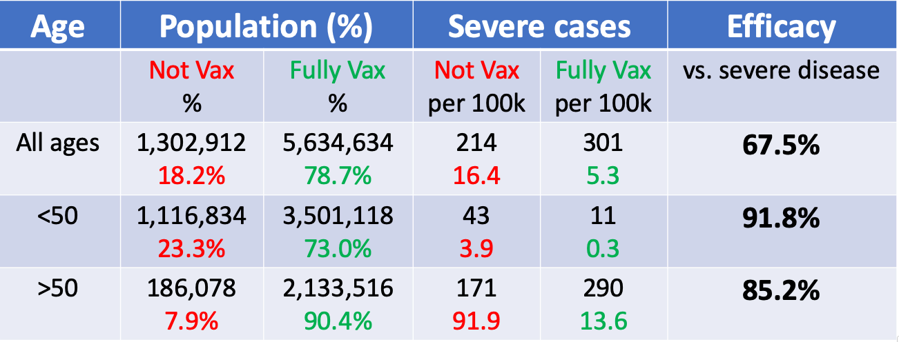 And because nearly 92% of people over 50 in the data set were vaccinated while only 76% of those under 50 were, the fully vaccinated number has a much higher representation of older people. In other words, high-risk patients make up 37.8% of the vaccinated group and only 14.3% of the unvaccinated group. Because we’ve moved a much larger percentage of high-risk patients into the vaccinated group, it skews the aggregate numbers away from each sub-group’s performance.