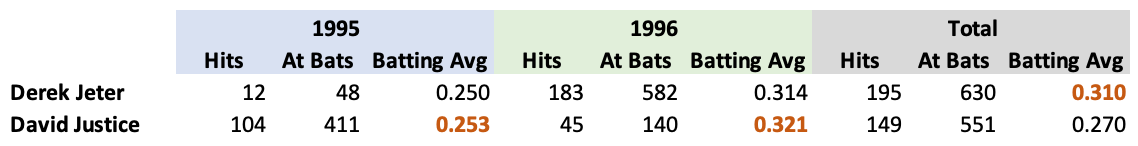How does this work? Jeter’s 1996 stats accounted for over 92% of his total performance over the two years, as he was 20 years old and only called up to the major league for a few games in 1995. Meanwhile, Justice’s 1996 stats were only 25% of his total performance due to a separated shoulder he suffered barely two months into the season. So while Justice performed better on smaller sample size, Jeter’s 183 hits in 1996 were the strongest signal for overall performance.