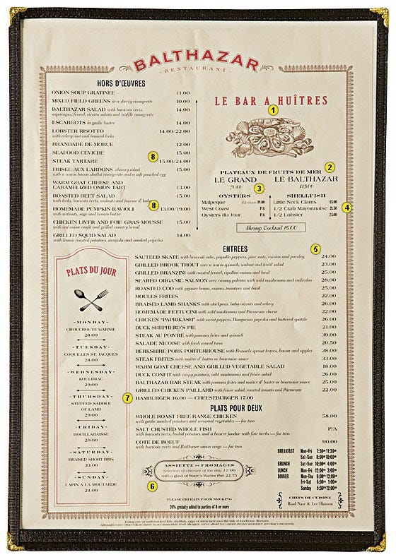 That’s the prime spot where diners’ eyes automatically go first. Balthazar uses it to highlight a tasteful, expensive pile of seafood. Generally, pictures of food are powerful motivators but also menu taboos—mostly because they’re used extensively in lowbrow chains like Chili’s and Applebee’s. This illustration “is as far as a restaurant of this caliber can go, and it’s used to draw attention to two of the most expensive orders,” Poundstone says.