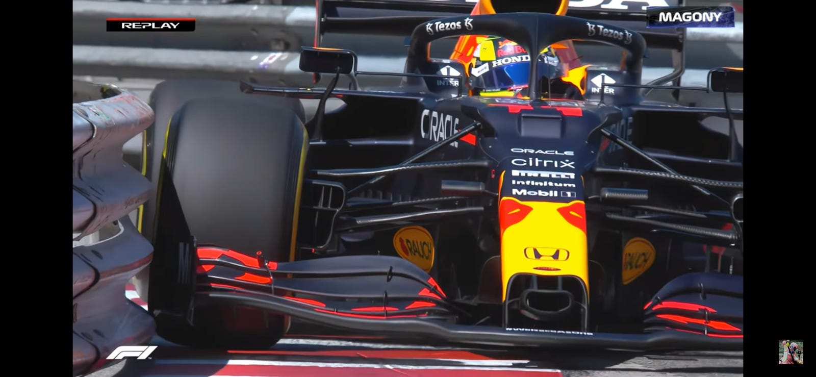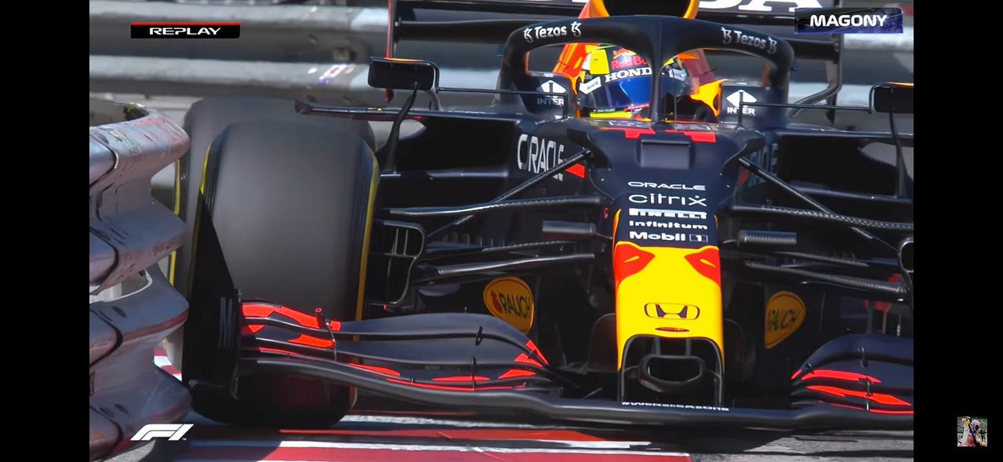 Noah here. In the lead-up to last week’s Monaco Grand Prix, F1 driver Sergio Perez took a corner pretty tight in practice. This isn’t unusual, as Formula 1 is a sport where cars are often separated by hundredths of seconds, but Monaco is the narrowest track of the season and when I say he took it close, I really mean he took it close.