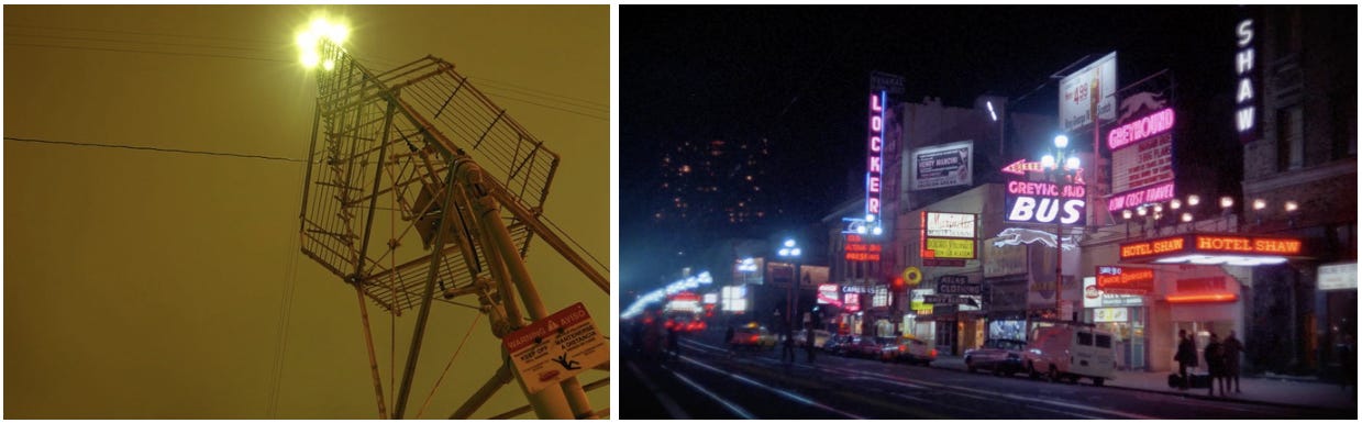 In the late-1800s, cities began experimenting with replacing gas lamps with electrical lighting. Some suspended arc lamps from 150ft towers (below left), which you may recall from the party at the moontower in Dazed and Confused. Others went with incandescent bulbs to light their streets. Though they remain the choice illumination of gentrifiers, incandescent (Edison) bulbs are inefficient and cities began to test fluorescent lights in the 1940s. While this led to beautifully lit cities (right, Market St in SF), fluorescent lamps were fragile and quickly fell out of favor.