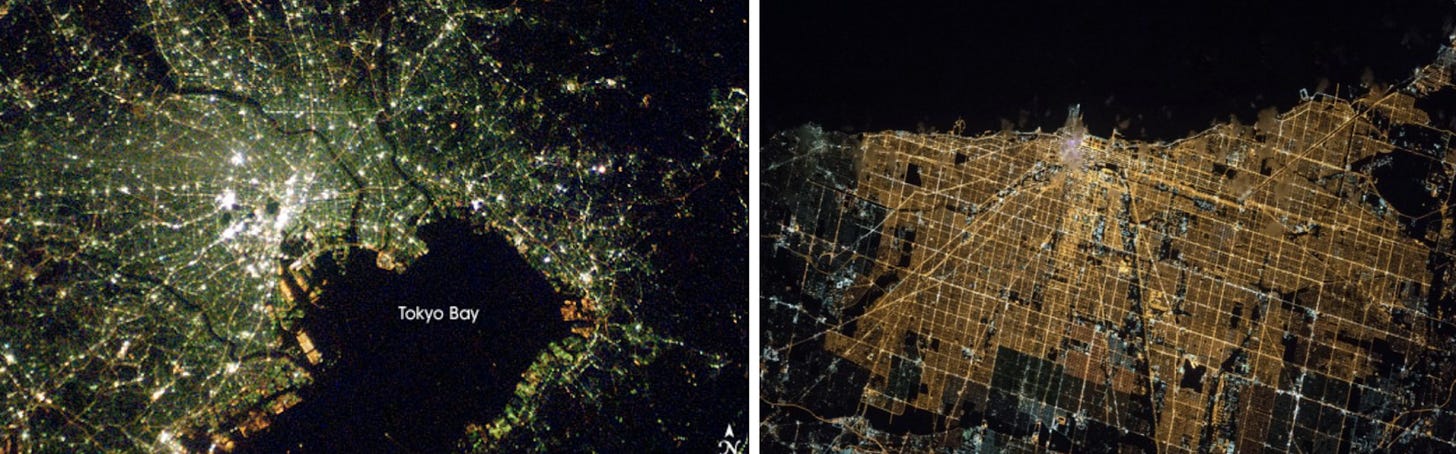 In their place, amongst other alternatives, mercury-vapor lamps started emerging in the 1950s. These are brighter than both fluorescent and incandescent lights, but emit a blue-green glow that has been described as metallic and harsh. The cool hue of these lamps can be seen in satellite imagery (below left, Tokyo) in those places that still use the technology. In the early 1970s, cities began to install high-pressure sodium lamps that consumed around half the energy of mercury-vapor and emit a golden hue described as “the lesser evil…better than blue.” Enticed by more light for less energy, Chicago Mayor Richard J Daley initiated a plan to install sodium vapor lamps on all residential streets, which made Chicago one of the most golden cities in the world (below right).