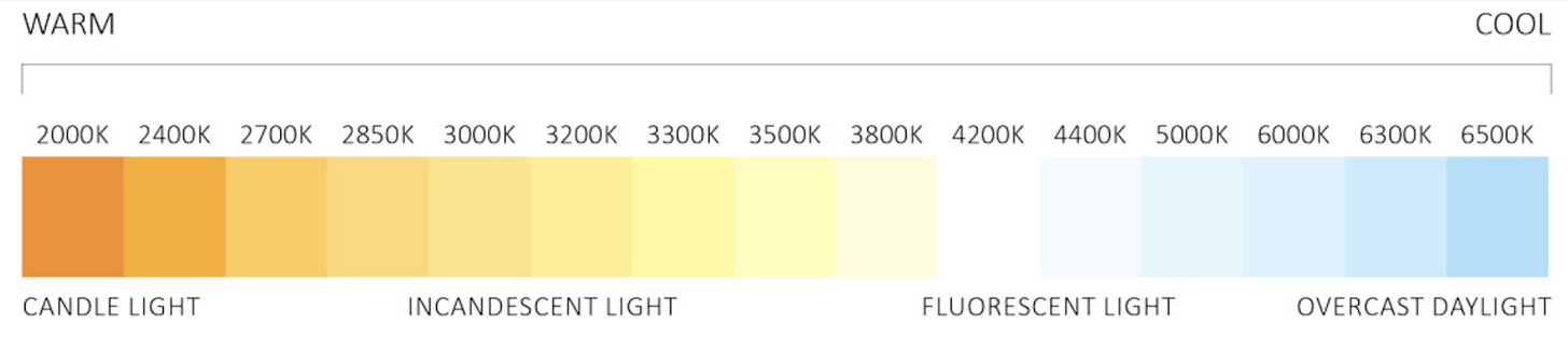 Lighting can be evaluated on three dimensions: efficiency (input electrical energy converted to light), color temperature (as shown below), and color rendering index (CRI, the ability to reveal colors). Incandescent bulbs are one of the most energy-inefficient products in daily use, with an efficiency of ~5%, but they have a desirable “warm” color temperature and high (favorable) CRI.