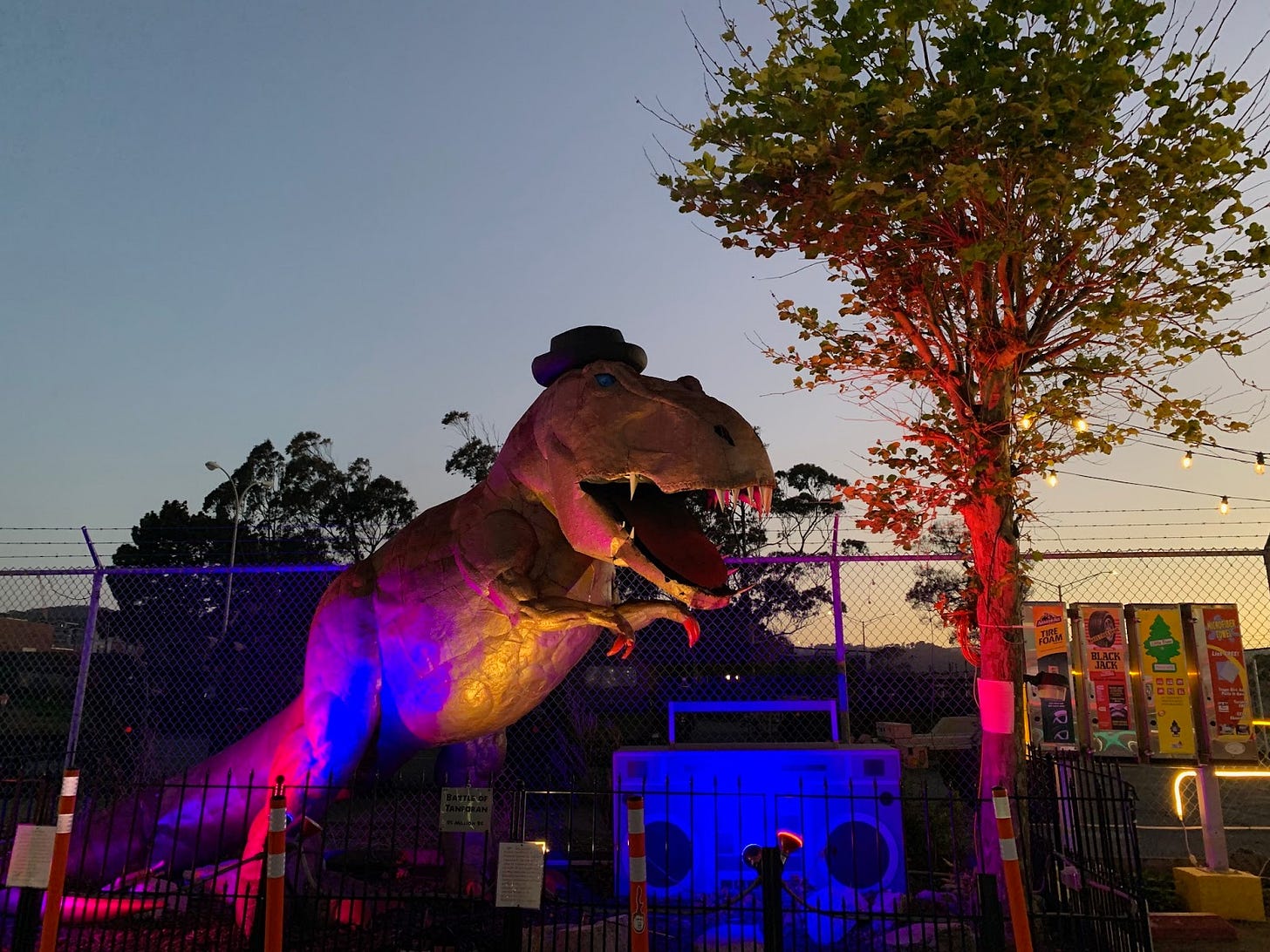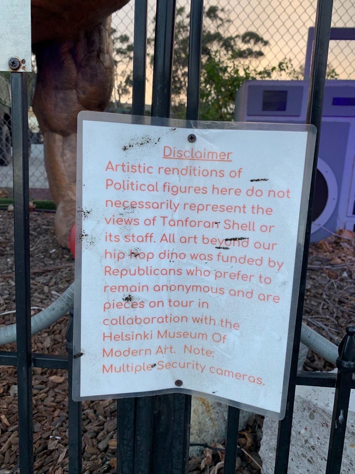 I was not expecting the T-rex in the tophat with the boombox at the Shell station. I went to get a closer look, as the Magdelayna track swelled behind me. There was a little sign in front of my saucy new dino friend.