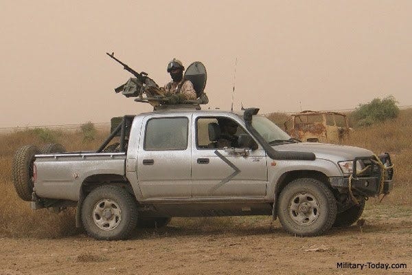 It is a familiar image, and the term for this, a technical, originated in the Somali Civil War. NGOs hired local gunmen to protect their men, and paid from “technical assistance grants.” The term now basically means any jury-rigged truck with fighters in it. The brand preference is often a Toyota, specifically a Hi-Lux, known for durability in austere conditions.