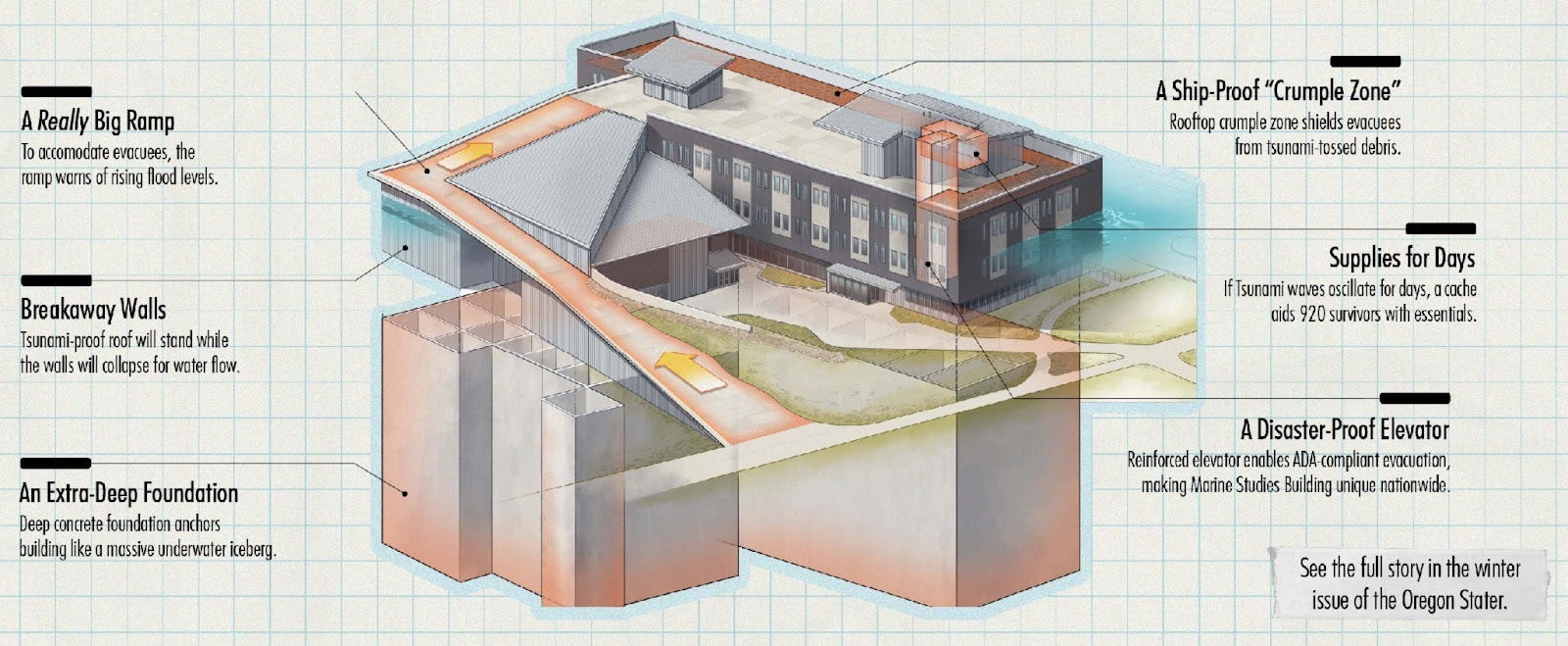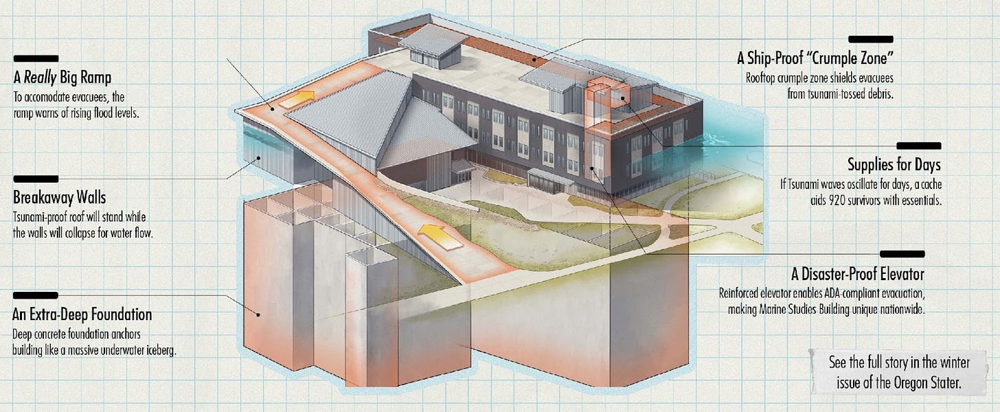 That's because the Gladys Valley Marine Studies Building, the jewel in the Hatfield Center treasure chest, is designed to withstand a 9+ magnitude earthquake and "XXL" tsunami event. The GVMSB, as it is known, is a vertical evacuation structure, a unique architectural feature making it a modern-day Noah's ark.