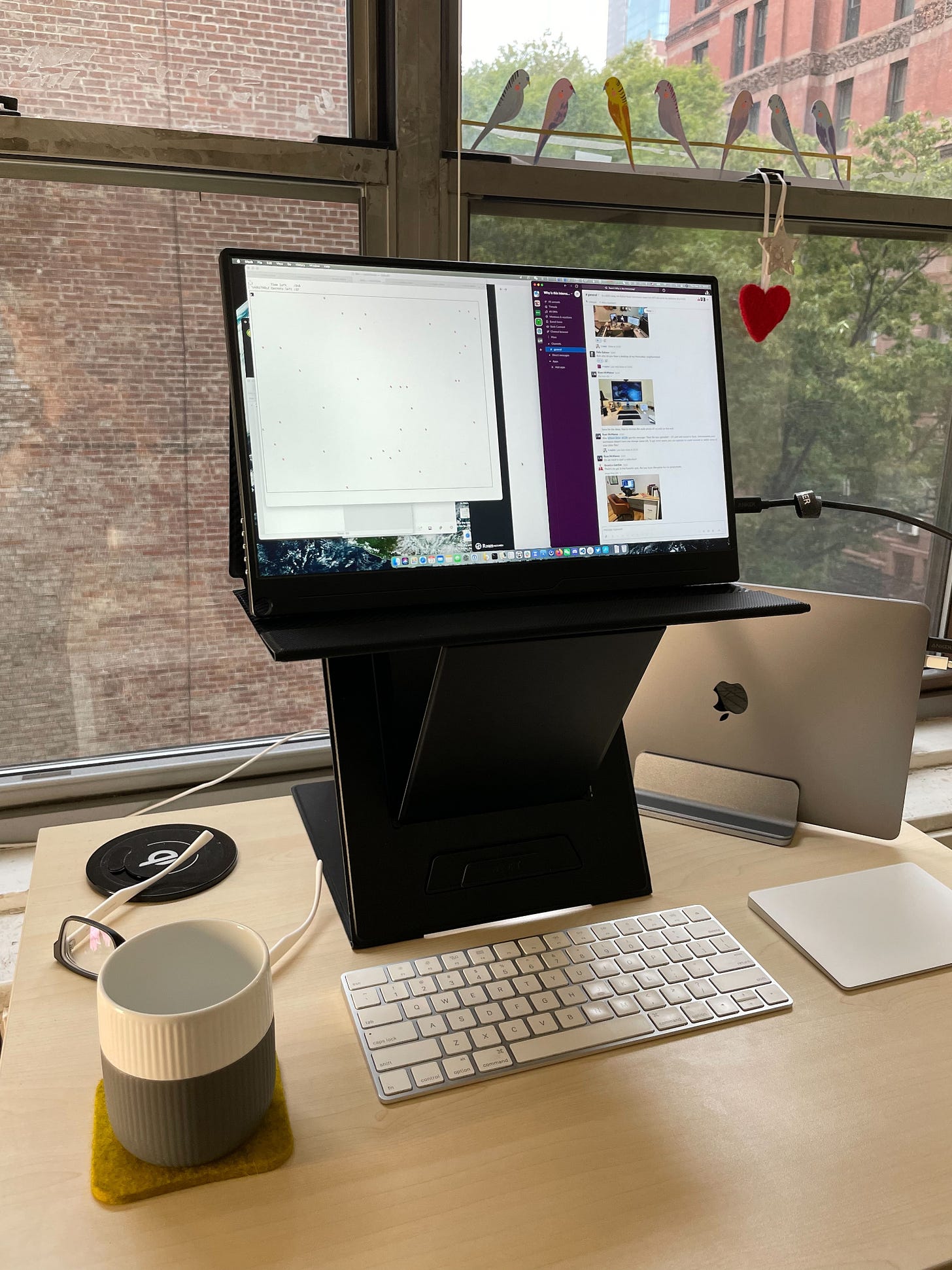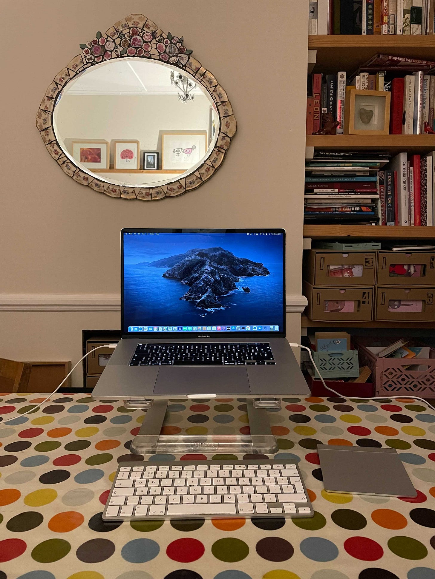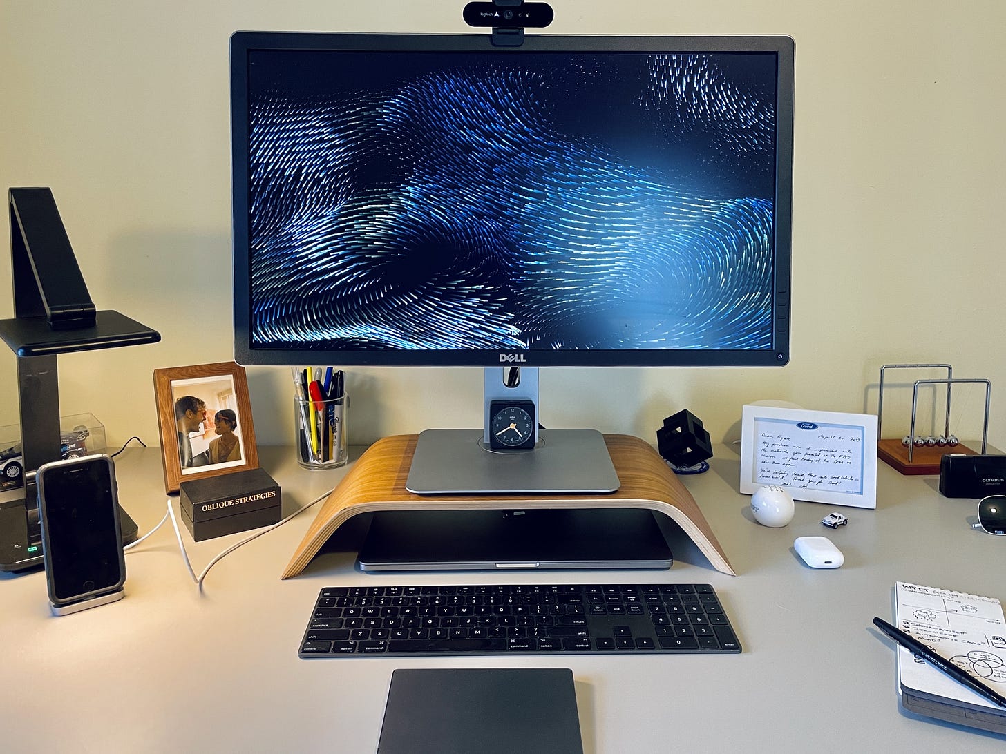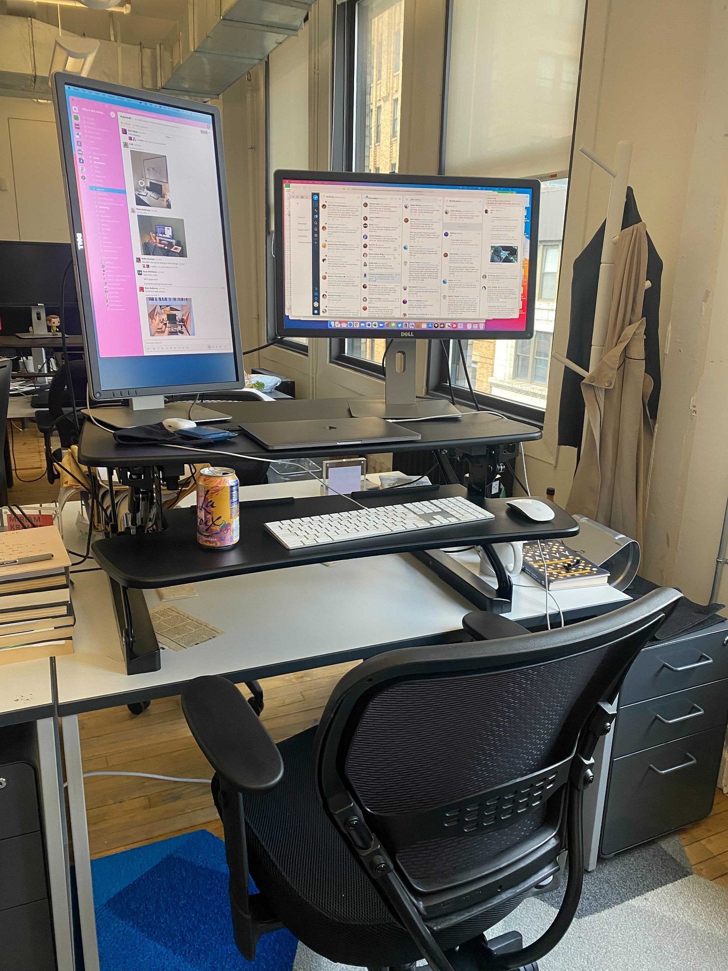 Noah here. When COVID first hit and work from home began in earnest, my office setup started with what was available. Luckily I had some space to carve out for myself, but it was a repurposed room, with a repurposed table, and a laptop stand. Using my separate keyboard and mouse required carefully balancing coffee table books on the pulled-out drawers of the table. I tweaked and shifted things until I finally invested in an adjustable desk, which was as much about being able to sit and stand as getting the ergonomics right. After speaking to an ergonomist at Herman Miller a number of years ago I’ve had a healthy fear of “turtling.”