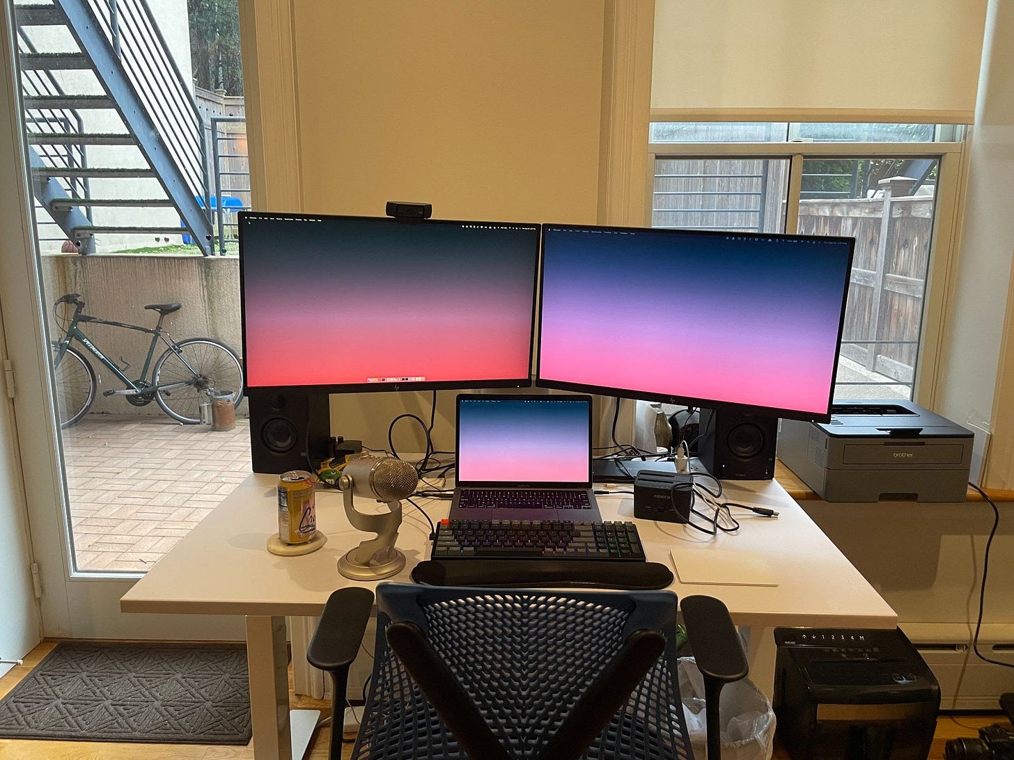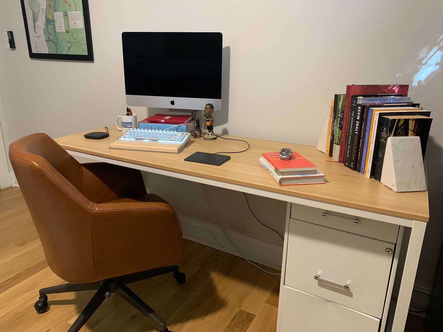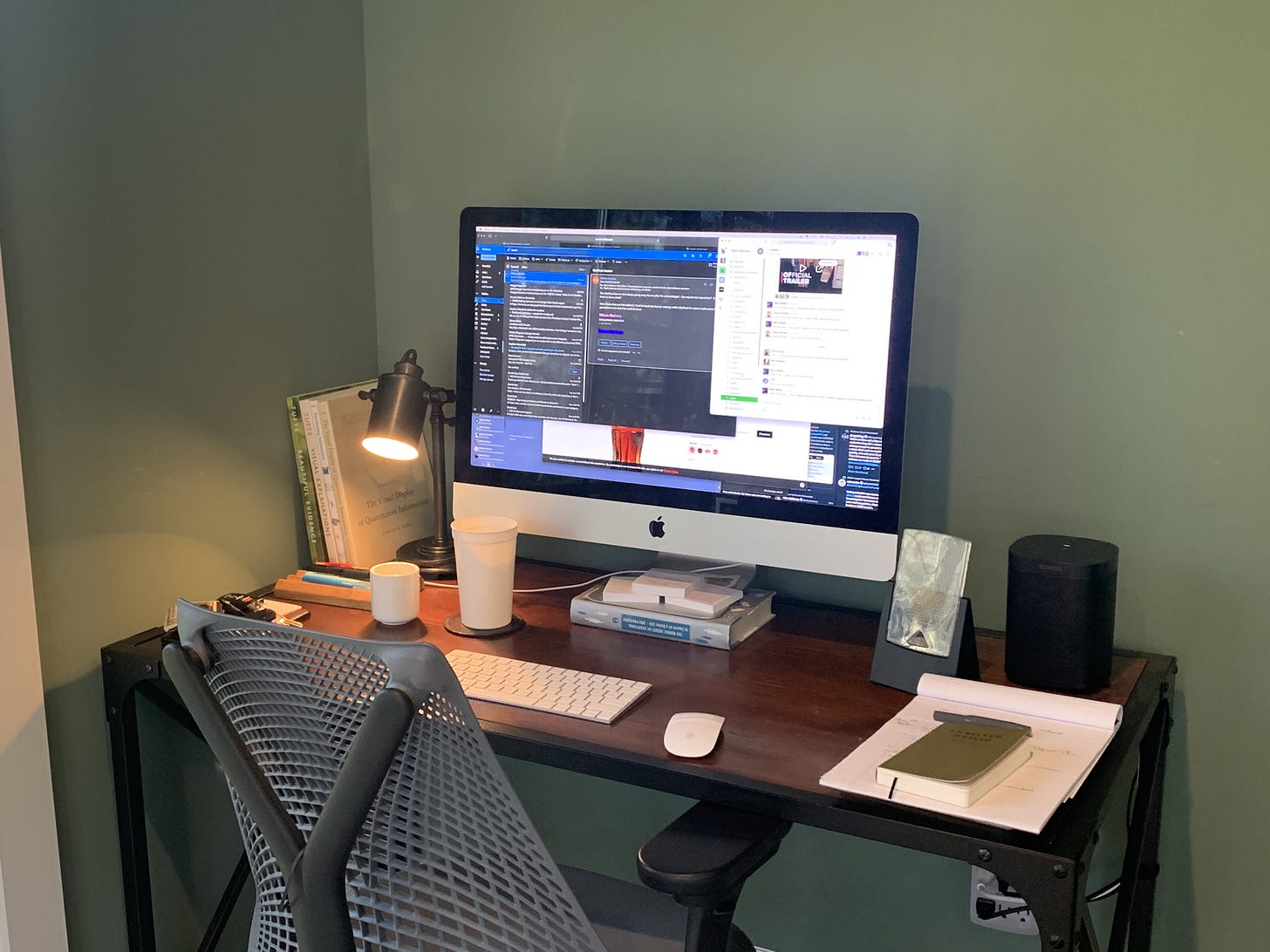 Since then my setup has continued to expand, with two monitors (with arms—how did I have a desk without monitor arms?), a nice mic, some new speakers, and a whole bunch of other junk. I love my setup now and can’t really imagine ever going back to an office. Presumably, I could transfer everything to that space, but that would almost definitely not happen. One thing I’ve wondered, actually, is why I have devoted so much more time and energy to ensure I have a comfortable and productive place to work than I ever did in an office. It’s probably partly to do with it being my house and my space, but I feel like there’s something deeper at play that I haven’t fully figured out.