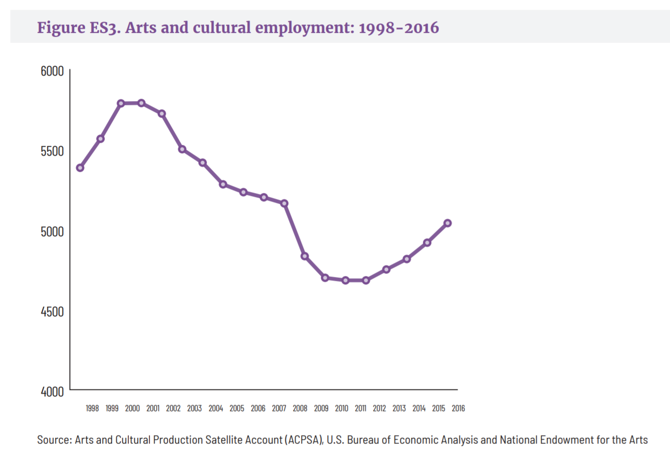 Arts and culture employment in the US:1998 to 2016. From a new report titled Artists and Other Cultural Workers by the National Endowment for the Arts. (NRB)