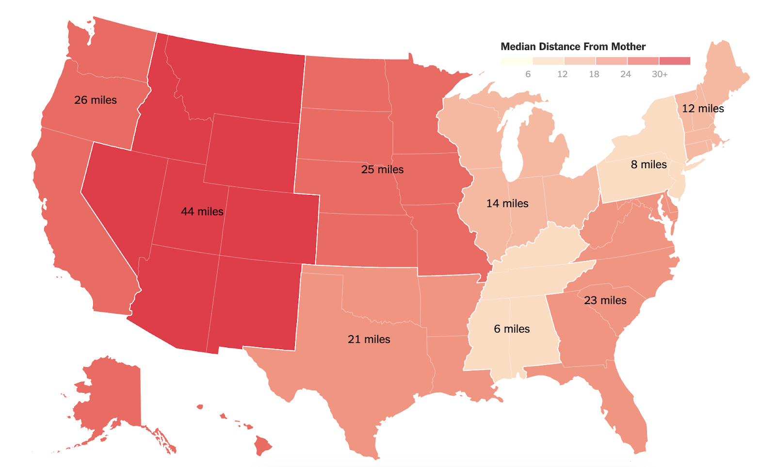 From The Upshot, a map of the median distance to mom: “Yet that picture masks a key fact about the geography of family in the United States: The typical adult lives only 18 miles from his or her mother, according to an Upshot analysis of data from a comprehensive survey of older Americans. Over the last few decades, Americans have become less mobile, and most adults – especially those with less education or lower incomes — do not venture far from their hometowns.” (NRB)