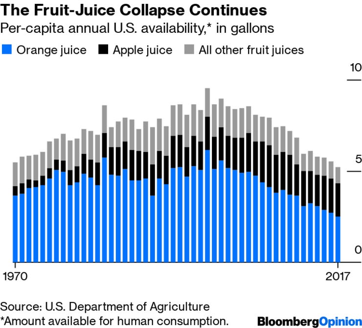 We’re not consuming nearly as much fruit juice as we used to. “Americans consumed 5.2 gallons of fruit juice per capita in 2017, according to data released by the U.S. Department of Agriculture over the summer. Not exactly consumed — the USDA doesn’t follow people around watching what they eat and drink, so what it measures is ‘food availability,’ which effectively means foodstuffs that are either consumed or wasted. In any case, this is the lowest fruit juice number since the USDA began tracking its consumption in 1970.” (NRB)