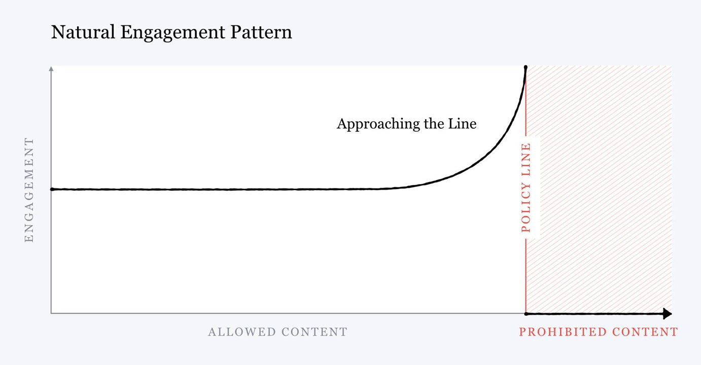 Mark Zuckerberg echoed this in a post he wrote last November about the content moderation problem. The closer someone gets to the policy line, he explained, the more extreme the content gets. Here’s how it was illustrated: