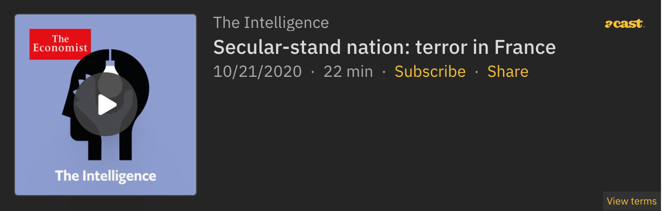 The Economist has been good at translating the rigor of the print product into audio formats. We’ve been tuning in to “The Intelligence.” The last episode tackled the murder of a French schoolteacher and also featured an interview with Russian opposition leader Alexi Navalny about the recent attempt on his life. (CJN)