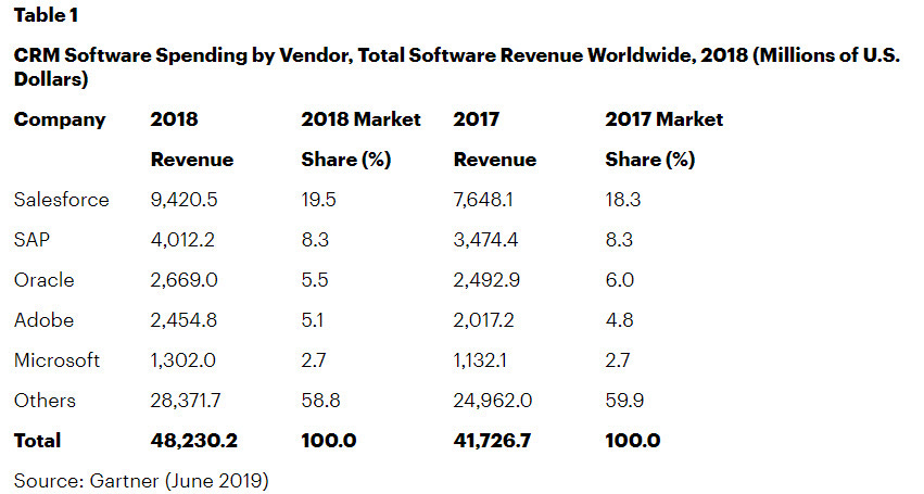 Salesforce is a ~$120 billion company whose main product is customer relationship management (CRM) software. They dominate a category that just about every company that sells something or services customers must have. With that said, I’ve always been amazed by just how little market share they actually have (they have run WSJ page one ads to this effect for years). This is the bullish case for software companies like Salesforce: despite being a behemoth they’ve still got less than 20% of the market. (NRB)