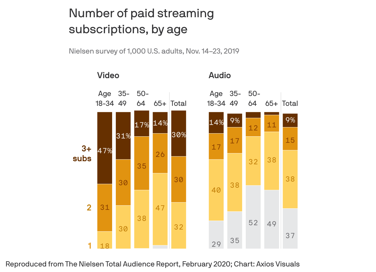 From the excellent Axios Media Trends email by Sara Fischer, number of paid streaming subscriptions by age. (NRB)