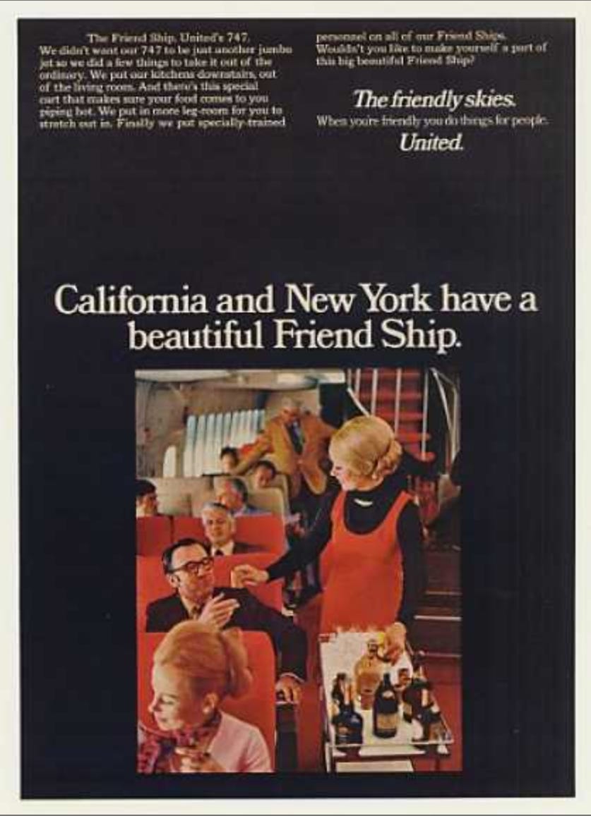 In the 1970s, United tried to continue to capture the zeitgeist while also fending off competition for it’s key business traveler routes. Notably, this is also a period when they tried to expand their base encouraging business travelers to “take someone along”. Given the economic situation in the United States in the 1970s, it’s not a huge surprise that the airline was trying to double the dollars from their existing customers.