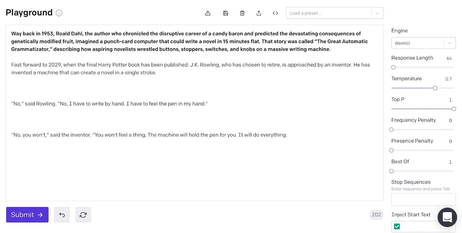But what Dahl satirized seventy years ago is almost a reality now. I can recreate many of the Grammatizator’s functions using the API for OpenAI’s language model, GPT-3. Language models are artificial neural networks that use probability, machine learning, and a huge body of training texts to master language prediction skills and provide increasingly human-like responses to text-based prompts. Released a year ago, the company’s beta API program lets civilians access GPT-3 remotely. Instead of punch cards, this language model trained with a massive selection of textual datasets, including the Common Crawl corpus (around one trillion words gathered through eight years of web searches), two “internet-based books corpora,” and the English-language version of Wikipedia. Through carefully structured prompts, I can enter all the “variable qualities” I want into OpenAI’s Playground interface, adjusting fields like “Presence Penalty” to keep the GPT-3 focused on certain themes or “Temperature” to control the randomness of the model’s sentences. It would cost about six dollars (and many, many hours of clicking) to generate a 75,000-word novel through OpenAI’s beta API.