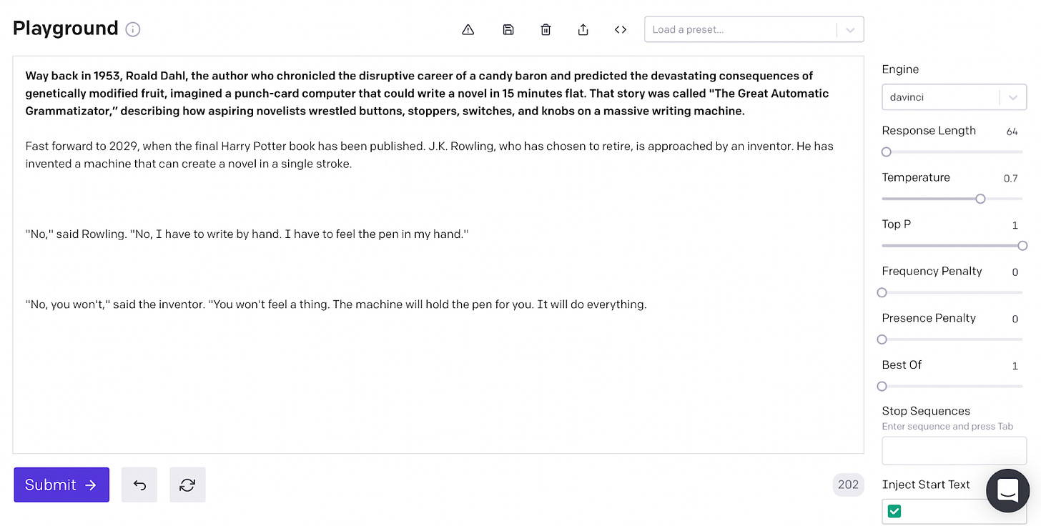 Dahl's story ends with the Great Automatic Grammatizator replacing about 70 percent of published authors. That’s a bit of a stretch. I subscribe to Brier's Law from WITI - The Machine Learning Edition: "The bar to get these things ok is low and great is high." And even when language models like GPT-3 can generate a coherent novel, nobody will be clamoring for AI-written books. We already have millions of human authors struggling to find readers! These language models won’t replace writers, but they will substantially change the way we write.