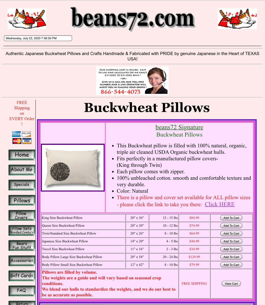 A few years ago, my neck was bothering me, and someone recommended I try a buckwheat pillow. They are super hard and can be shaped in almost any way. It helped, and I’ve been a convert ever since. The site recommended to me was beans72.com, which, if it hadn’t come with a promise it was legitimate, I never would have ordered from. As you can see from the screenshot below, development looks like it may have been paused in 1998, but I can attest to the quality of their pillows and the speed of their shipping.