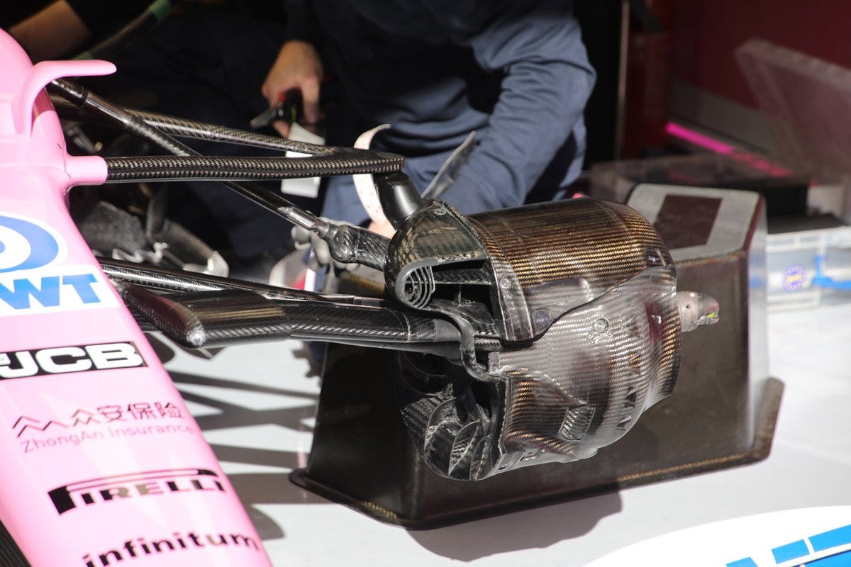 Noah here. In last week’s Stiffness Edition, you may have noticed a Brake Duct of the Day. Those brake ducts, pictured below, are the source of some controversy in Formula 1 currently. They belong to Racing Point, a team owned by billionaire Lawerence Stroll (whose son Lance, conveniently, is one of the two drivers). The team is what’s called a “customer team” as they buy their engine and several other components from a manufacturer, in this case, the rival Mercedes team. That creates an interesting competitive dynamic, as you have three “works” teams in the sport (Renault, Ferrari, and Mercedes) providing engines and parts for five of their competitors (Racing Point and Williams have Mercedes engines, McLaren has a Renault, and Alfa Romeo and Haas use Ferrari). Missing from that list are Red Bull and its sister team AlphaTauri, who are both owned by the energy drink manufacturer and get their engines from Honda, who don’t field a team.