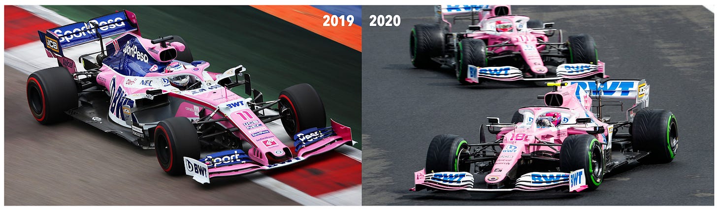 Comparison of the 2019 and 2020 Racing Point cars. Notice the difference in the nose and work your way backward.