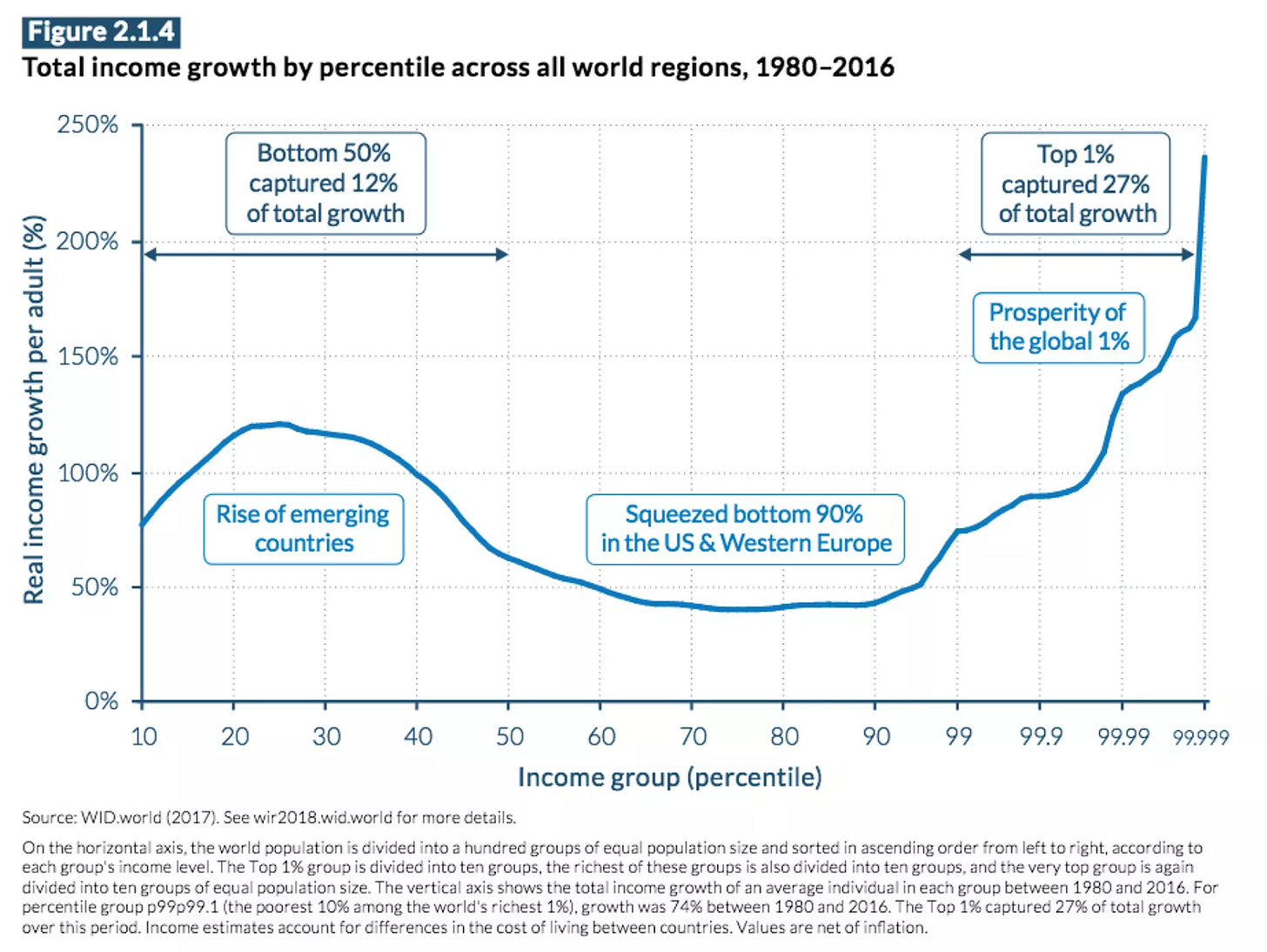 These sites are unquestionably good reminders, but they’re also cited frequently to make an argument that we should focus less on the local negative and more on the global positive. It’s essentially a macroeconomics trumps microeconomics approach to talking about the world’s problems: Prioritizing the greater good of the global populous over the individual good of a person, city, or even country. It’s a story told by Steven Pinker and his book Enlightenment Now, which argues that on aggregate the world is significantly better/safer/healthier than it’s ever been despite the individual experience of millions who may be worse off. Or even more specifically in the data of Branko Milanovic’s “elephant graph” and the updated version from Thomas Piketty, Emmanuel Saez, and Gabriel Zucman: