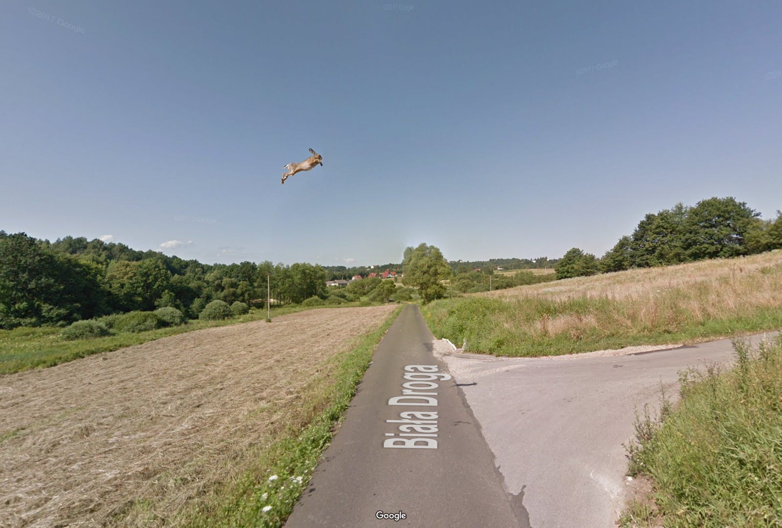There’s a whole culture of scouring Google Maps/Earth for weird stuff. Here’s a bunny caught mid-air by the Street View camera in the village of Olszowice, Poland. (NRB)