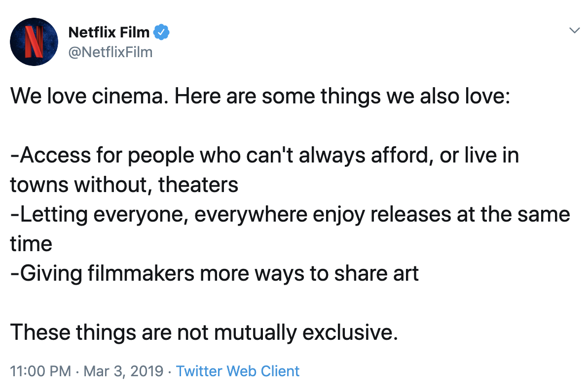 Noah here. Netflix seems to always be in the news, but it was a particularly big subject around Oscar time. Bob Greenblatt, AT&T’s new head of HBO said "Netflix doesn't have a brand” and Steven Spielberg started a campaign with the Academy to block movies made for streaming services from winning Oscars. Netflix responded with a Tweet: