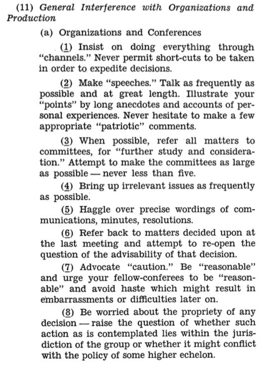 I had forgotten about this until I was digging through my Evernote for something else on Saturday. It comes from the OSS (precursor to CIA) “Simple Sabotage Field Manual.” From the CIA.gov page: “This classified booklet described ways to sabotage the US’ World War II enemies. The OSS Director William J. Donovan recommended that the sabotage guidance be declassified and distributed to citizens of enemy states via pamphlets and targeted broadcasts.” It’s shocking how much this just sounds like every day at a big company. (NRB)